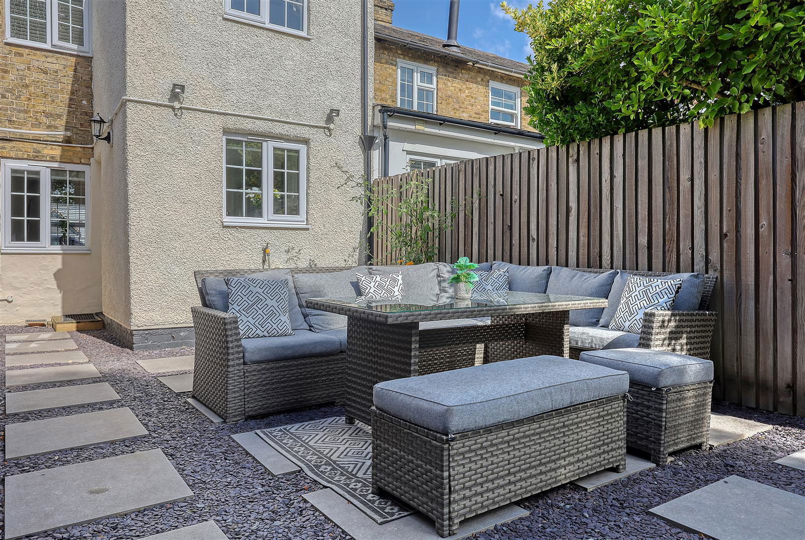 Externally the property boasts a larger than average, private, landscaped rear garden, measuring approximately 40m in length (130 ft) with seating areas, mature planting and raised borders.