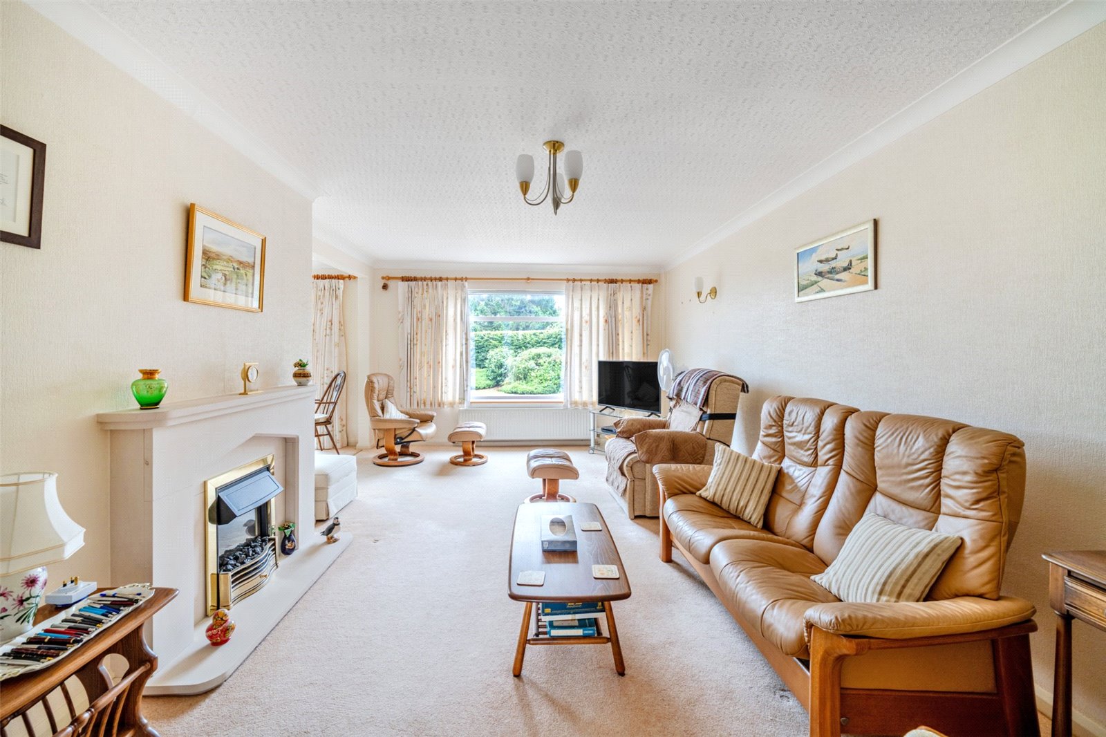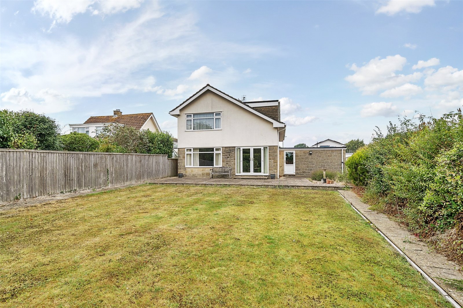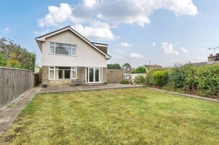 The property is set back behind areas of lawn, with a long driveway providing parking for several vehicles and leading to the garage. The good sized south facing rear garden is mainly laid to lawn with established planting and a large patio area stretching across the back of the house, providing an ideal space for relaxation and outdoor dining.