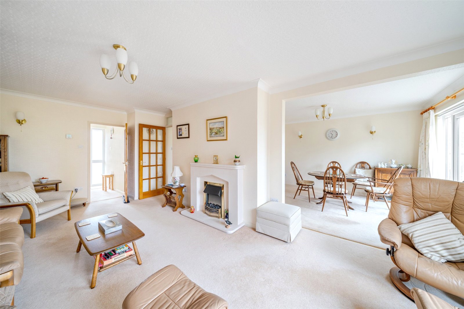 The property is set back behind areas of lawn, with a long driveway providing parking for several vehicles and leading to the garage. The good sized south facing rear garden is mainly laid to lawn with established planting and a large patio area stretching across the back of the house, providing an ideal space for relaxation and outdoor dining.