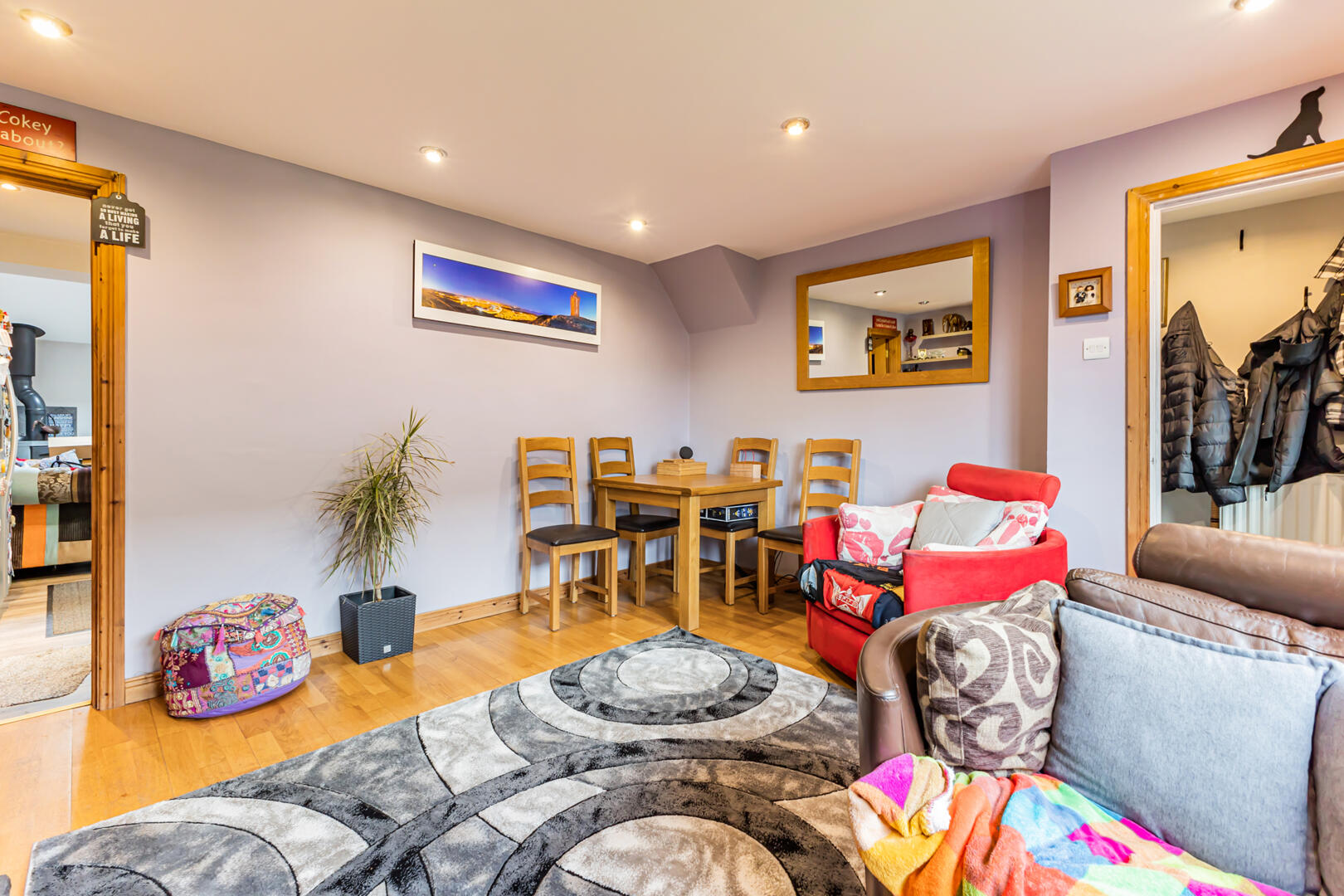 Living/Dining - 3.81m x 4.57m (12'6" x 15') - Ample living space with outlook over the rear garden, Velux windows, recessed spot lighting, feature multi burning stove with glass hearth