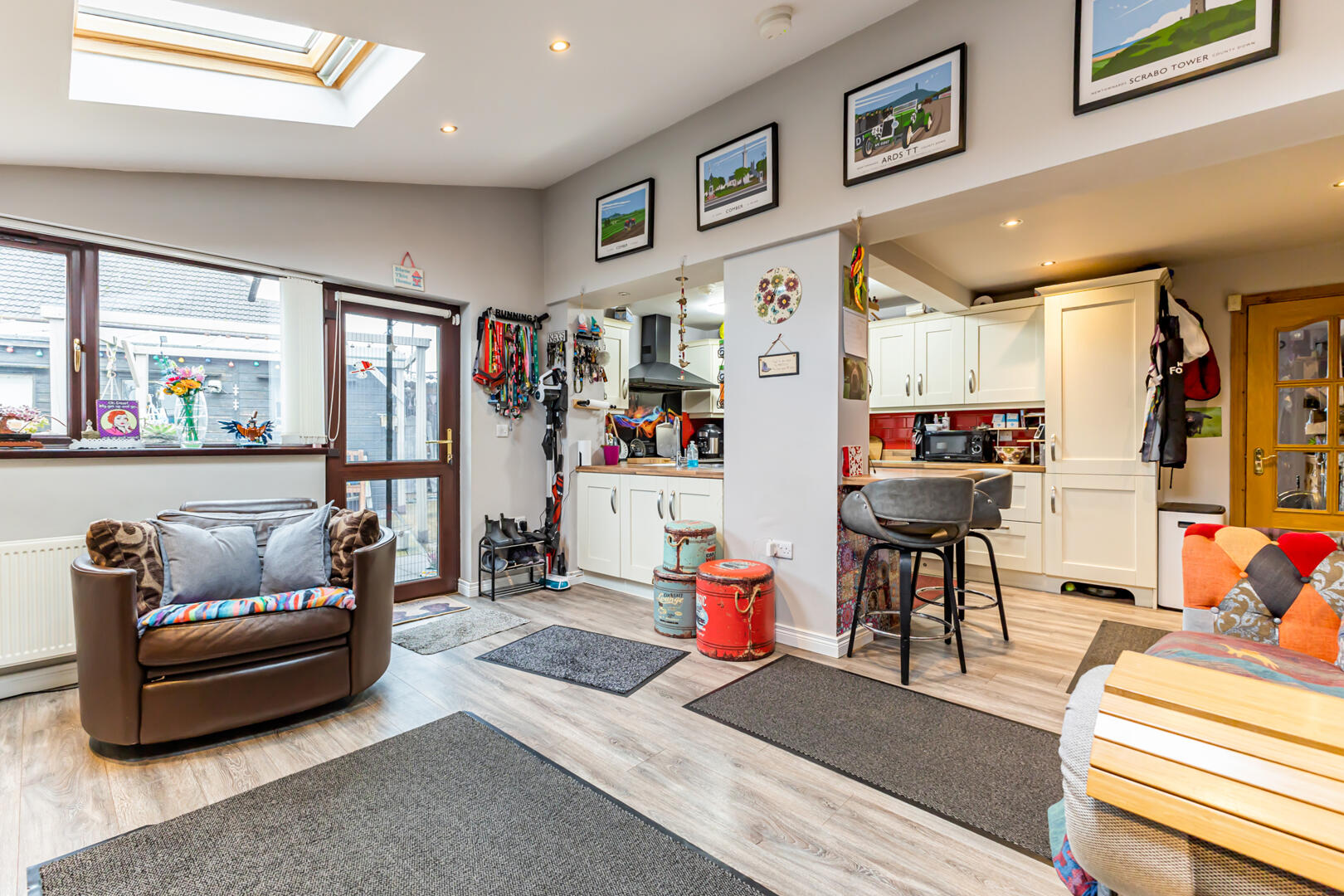 The property is approached by a fully enclosed front garden with low maintenance artificial lawn, providing excellent kerb appeal. On entering, the welcoming hallway leads to a bright family lounge with feature open fireplace, perfect for cosy evenings. The true heart of the home is the open plan kitchen, living, dining space overlooking the rear garden, designed with modern family life in mind.