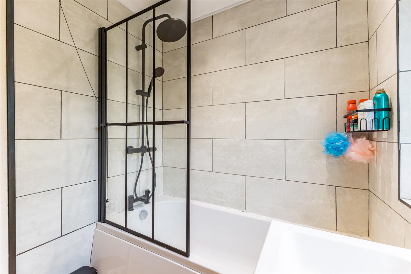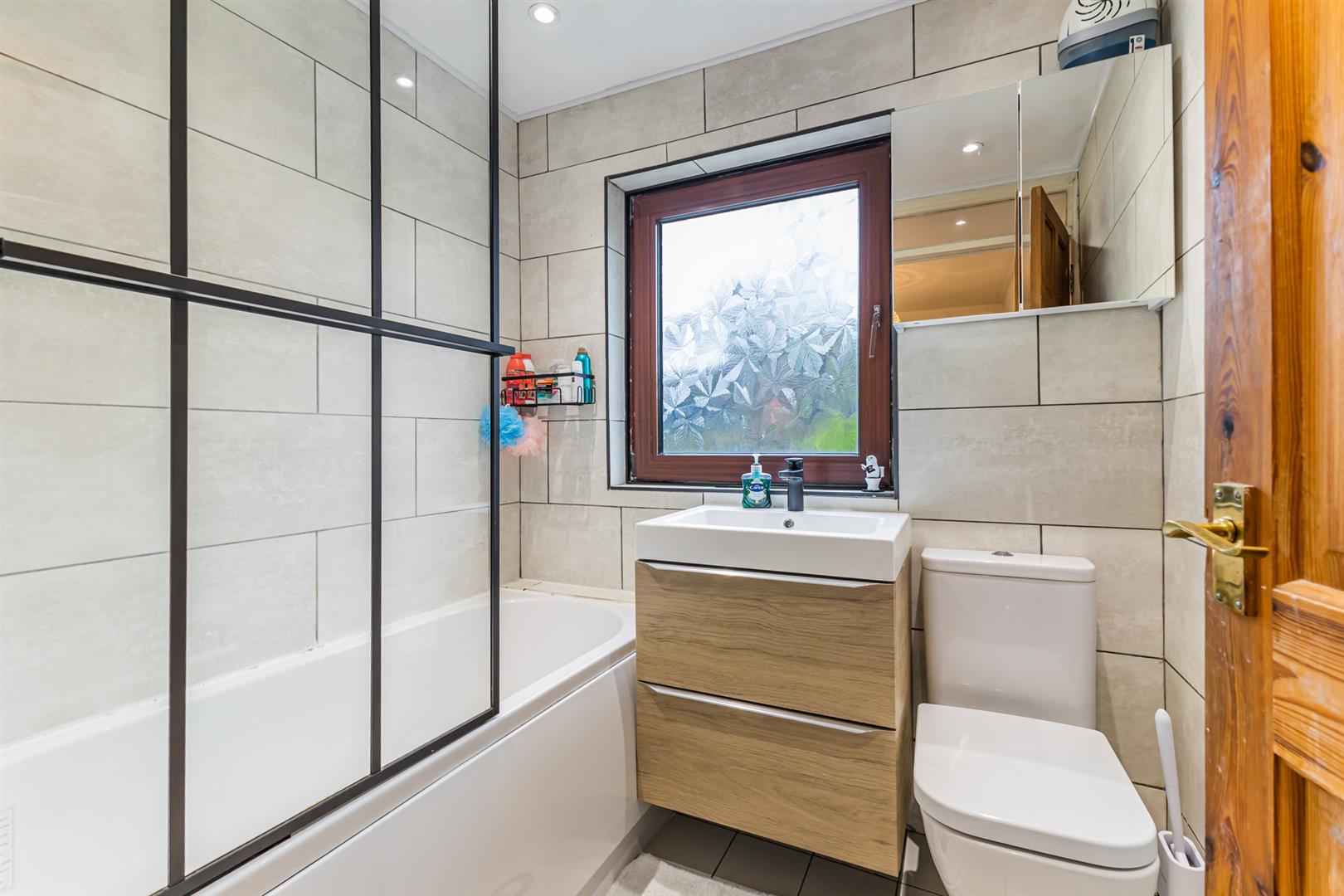 Family Bathroom: - 5'8" x 6'2" - Porcelain tiled flooring, fully tiled walls, outlook to rear, spotlights, bath with glass shower screen, mixer tap and thermostatically controlled handheld shower and overhead drencher, floating vanity unit with drawers for storage, sink and mixer tap, low flush WC