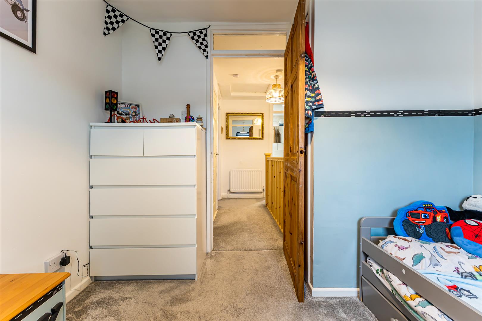 Bedroom Three: - 8'10" x 8'9" - Outlook to front, carpet, storage cupboard