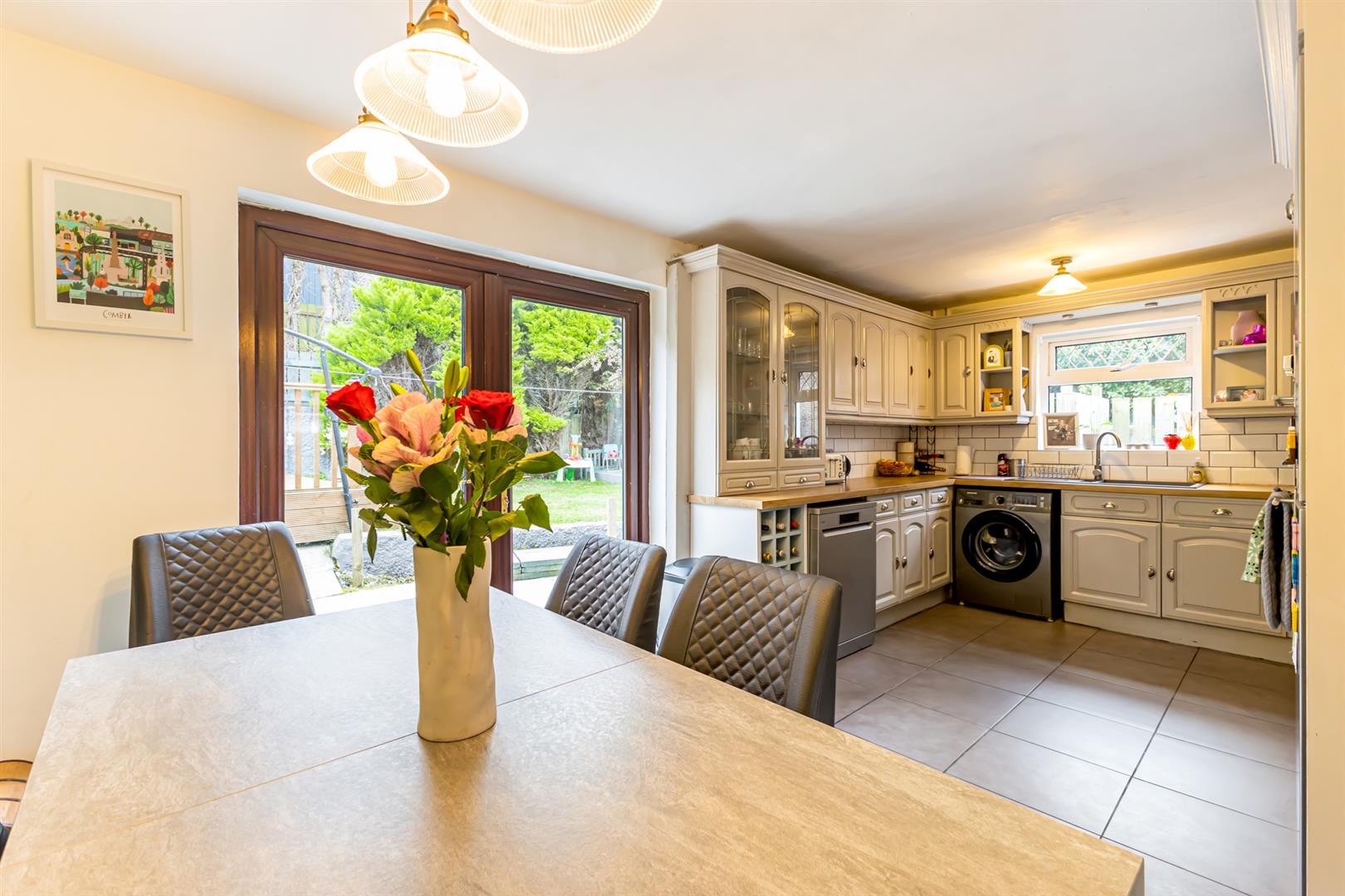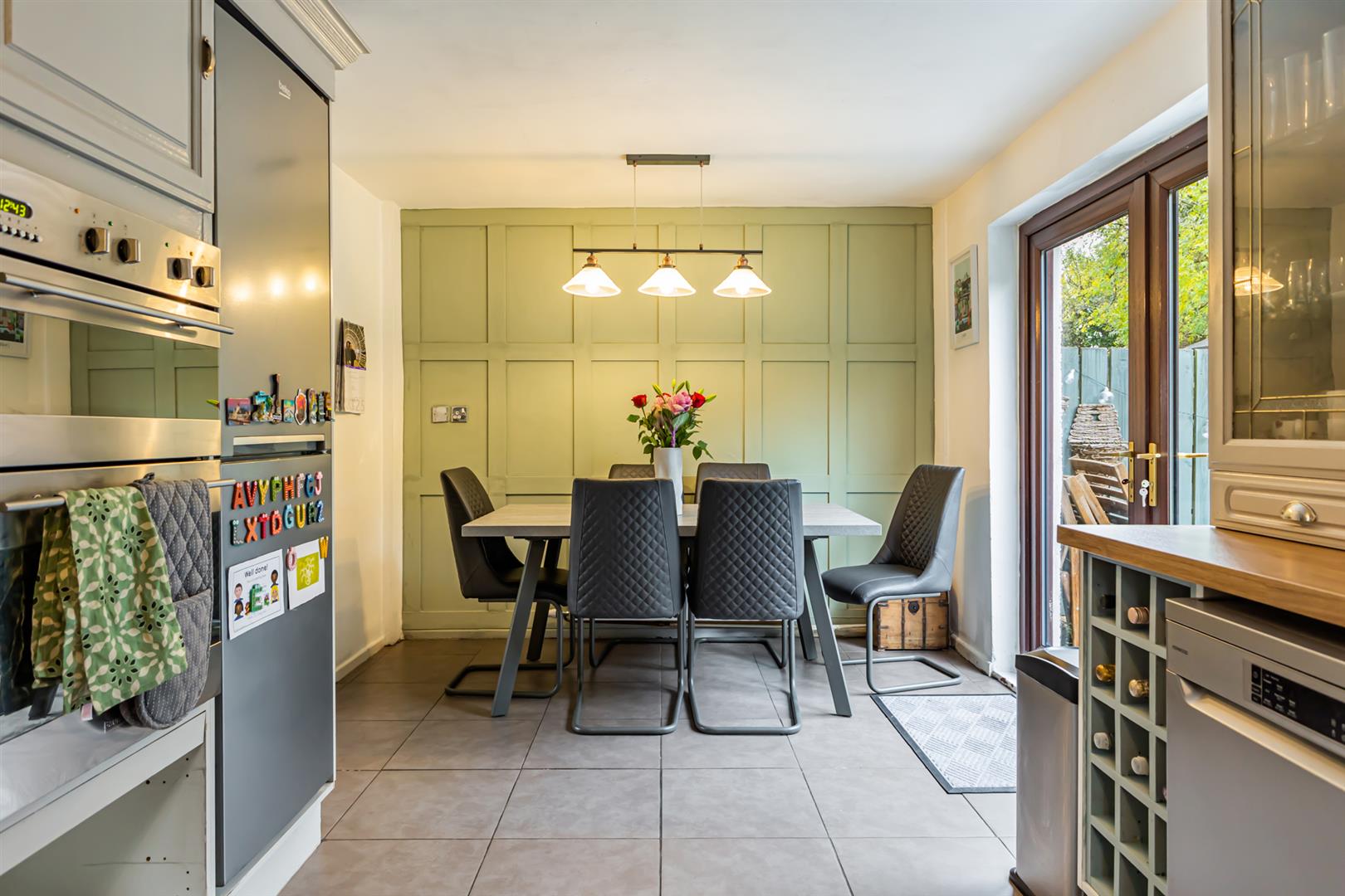 Open Plan Kitchen / Dining - 9'7" x 18'1" - Dining: Ceramic tiled flooring, feature panelled wall, ample dining space, French doors to rear garden, feature light