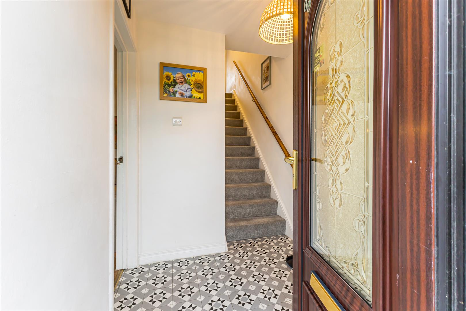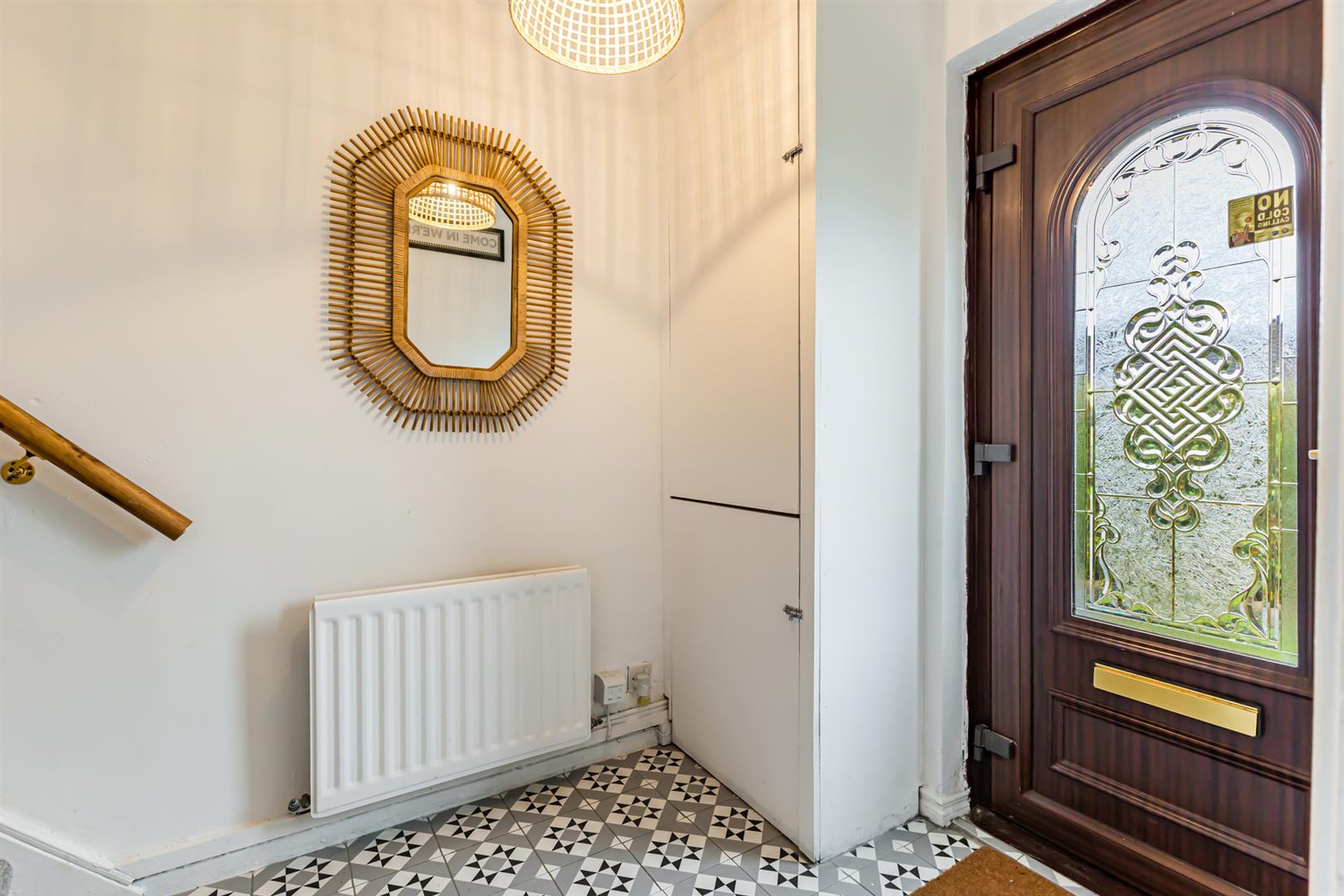 Entrance Hall: - 13'9" x 5'10" - Decorative tiled floor, storage cupboard