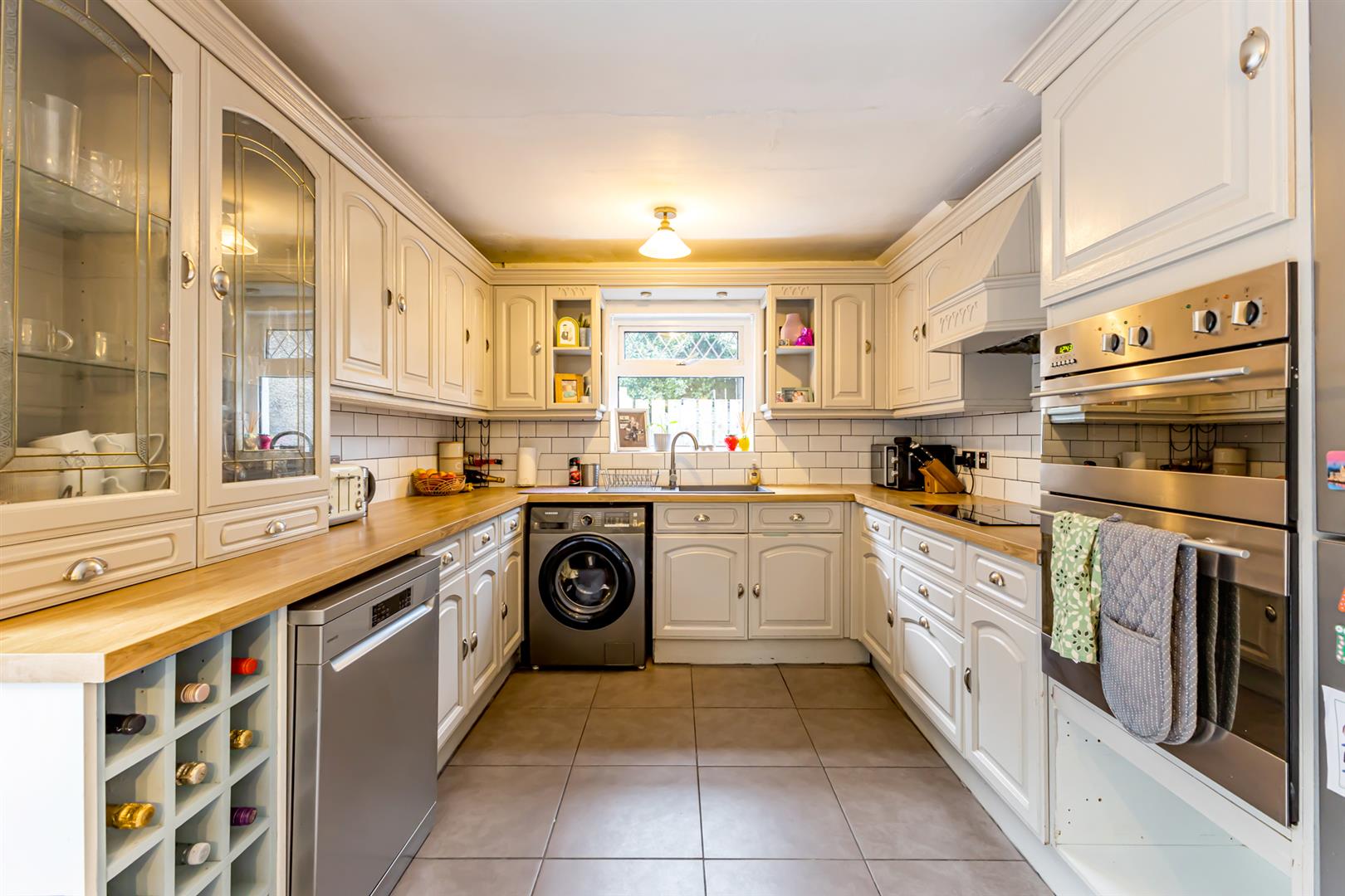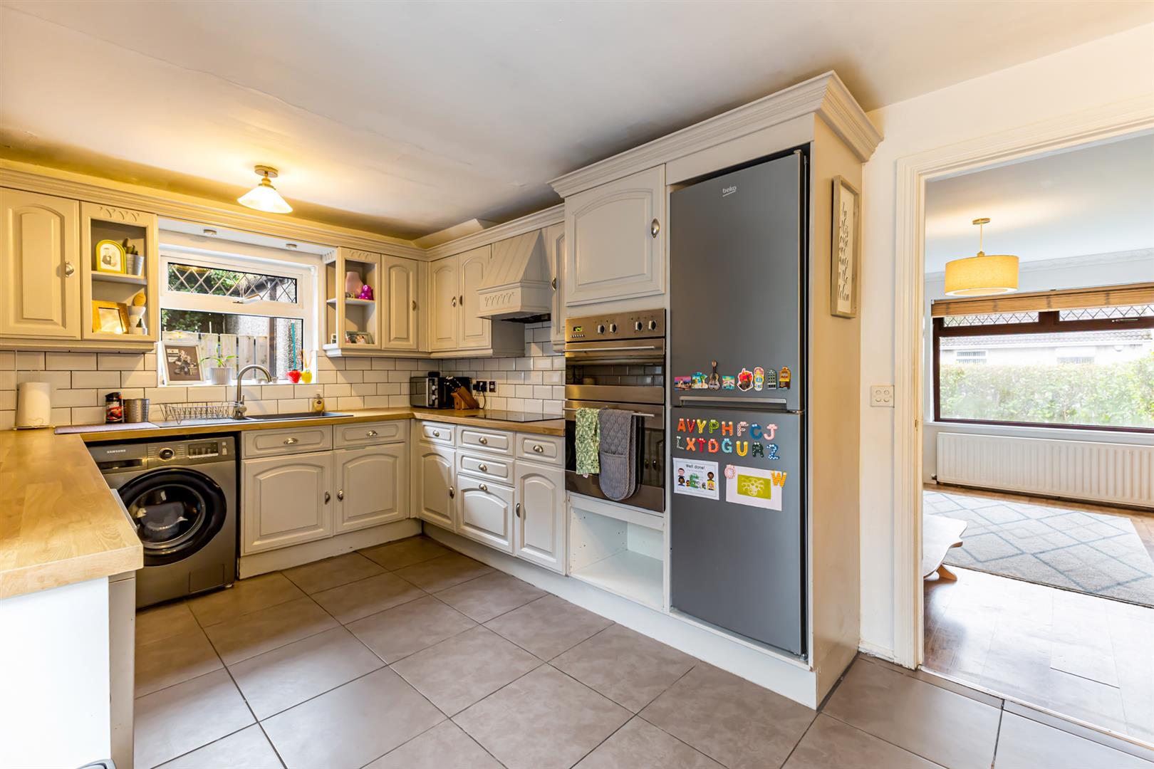 Kitchen: Ceramic tiled floor, outlook over rear garden, range of low- and high-level units with solid wood doors and wood effect worksurface, display cabinets, wine rack, space for dishwasher, space for washing machine, ceramic sink and drainer with chrome mixer tap, integrated electric oven / grill, space for fridge / freezer, Beko four ring electric hob, extractor fan