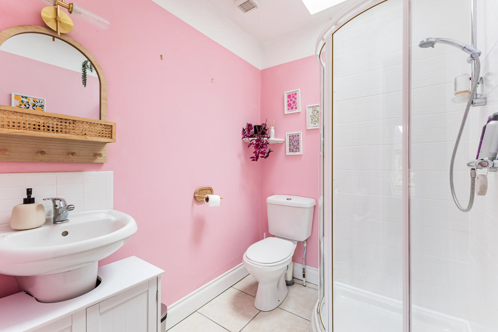 Ensuite - 2.01m x 1.68m (6'7" x 5'6") - Velux window, porcelain tiled flooring, wall lights, extractor an, white three-piece suite comprising; pedestal sink with chrome mixer tap and tiled splashback, shower enclosure with thermostatically controlled shower with tiled walls and low flush WC