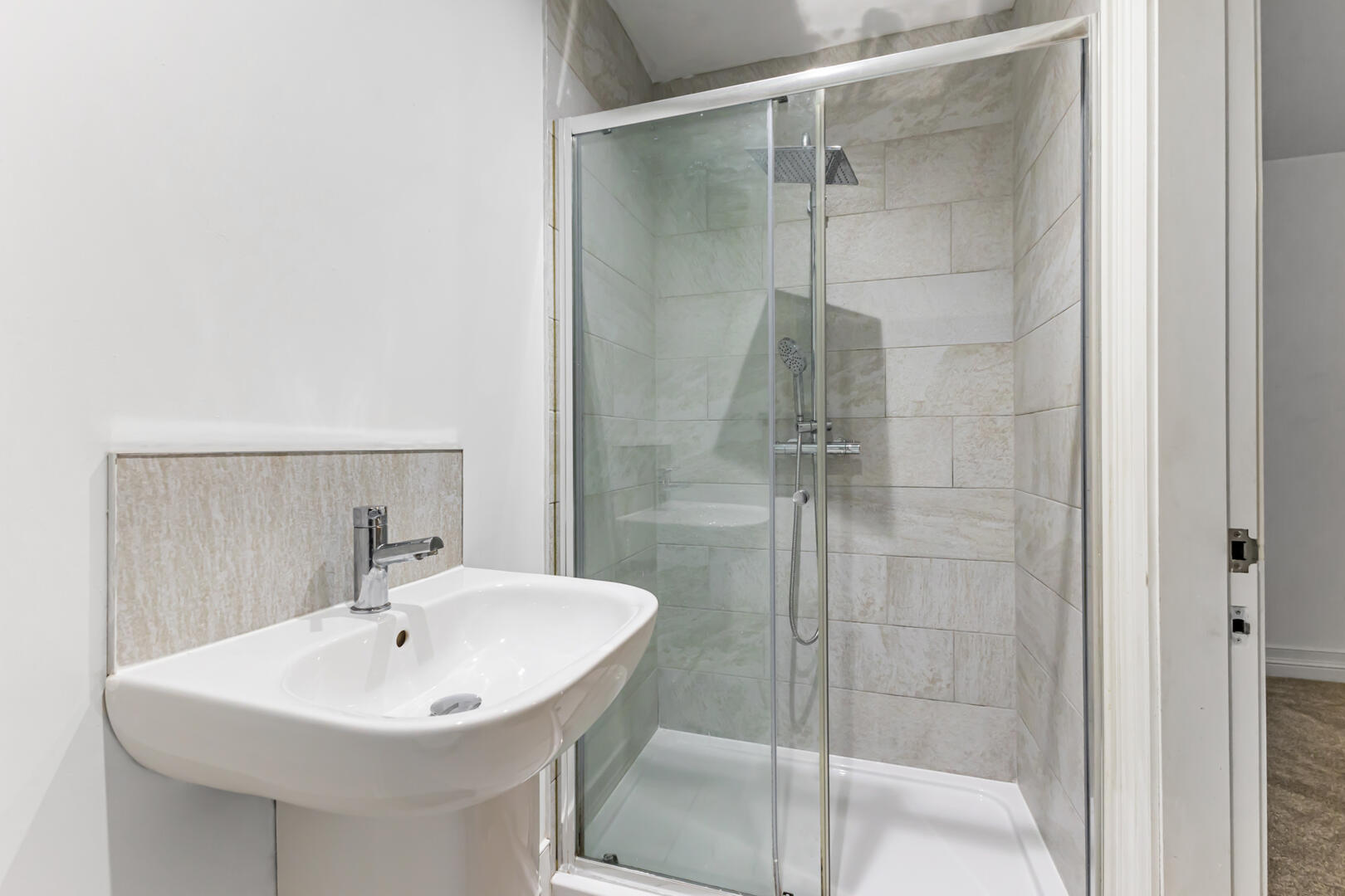 En-Suite Shower Room - 2.6m x 1.19m (8'6" x 3'10") - Porcelain tiled floor, tiled splashback, outlook to rear, chrome heated towel rail, extractor fan, recessed spot lighting, low flush WC, ? pedestal ink with chrome mixer tap, shower enclosure with tiled walls, glass sliding door, thermostatically controlled handheld shower and overhead drencher