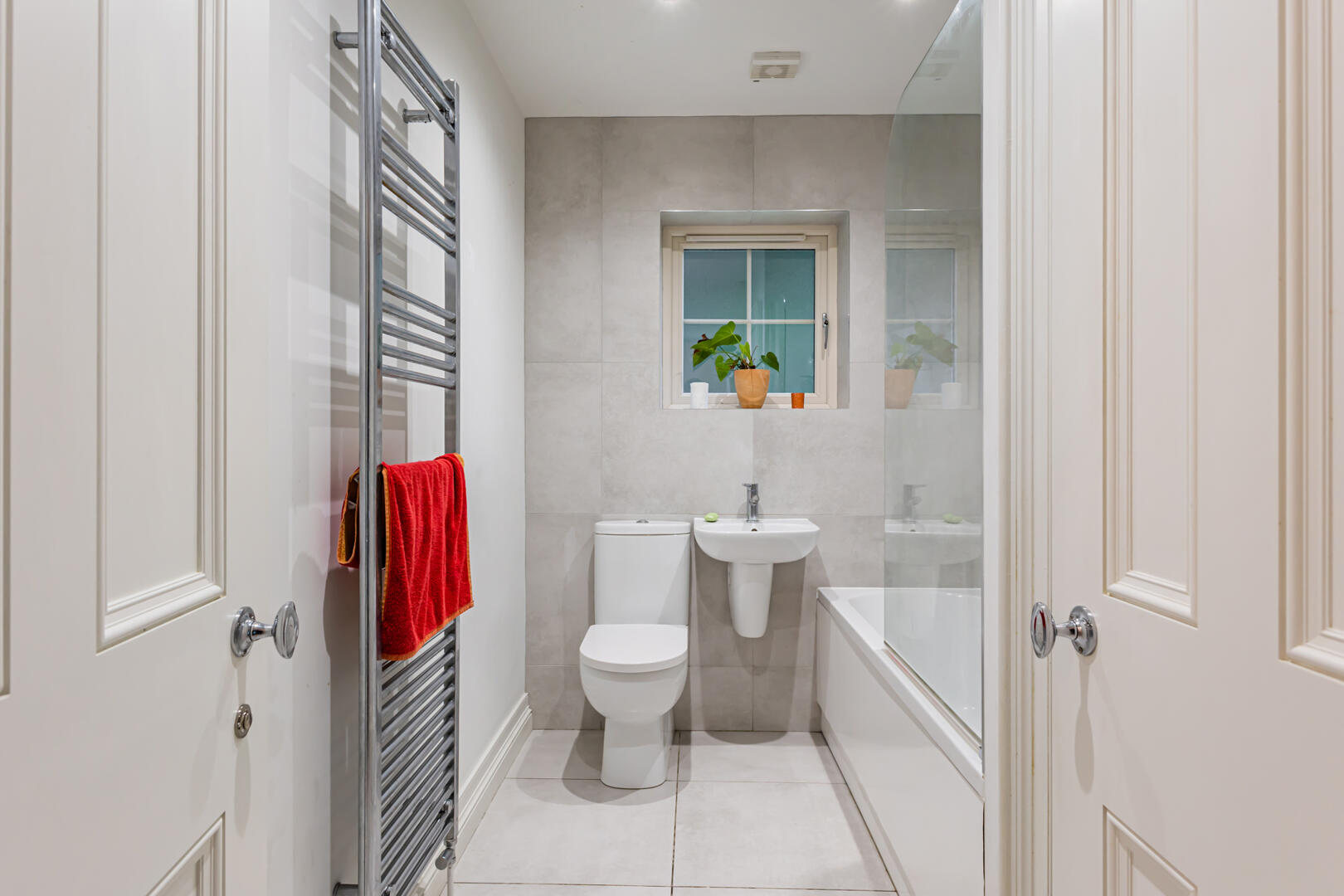 Bathroom - 2.6m x 1.86m (8'6" x 6'1") - Porcelain tiled floor, outlook to rear, chrome heated towel rail, storage cupboard, three-piece white modern suite comprising; low flush WC, bath with glass shower screen, chrome mixer tap, thermostatically controlled shower