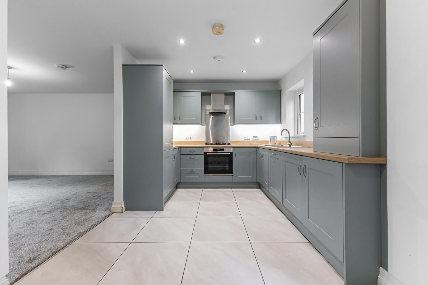 Inside, the accommodation comprises a bright and spacious lounge, a fully fitted bespoke kitchen with integrated appliances and ample dining space, two well-proportioned bedrooms including a principal bedroom with a modern shower room, and a separate contemporary bathroom.