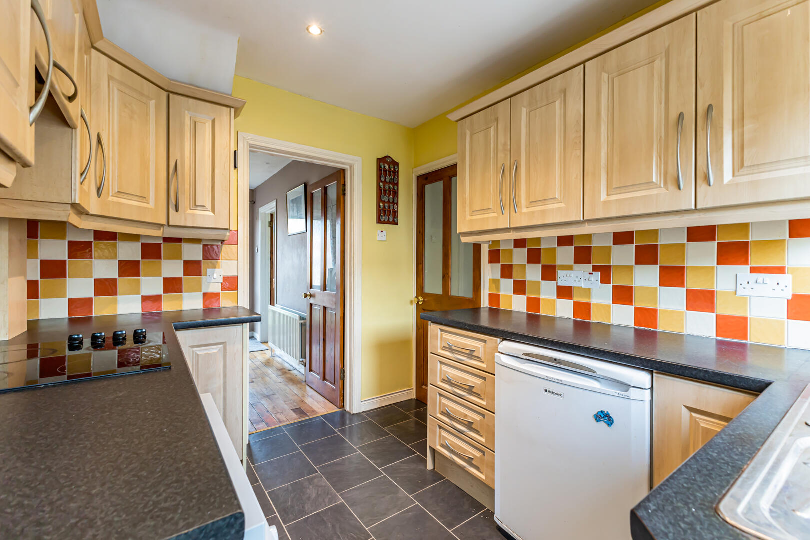 Kitchen - 2.95m x 2.44m (9'8" x 8') - Outlook to rear, laminate wood floor, tiled splashback, recessed spotlights, range of low- and high-level units with laminate work surface, integrated Hotpoint electric oven / grill, four ring electric hob, extractor fan, space for dishwasher, space for fridge / freezer, single bowl sink with drainer and chrome mixer tap, uPVC door with glass inset to rear garden