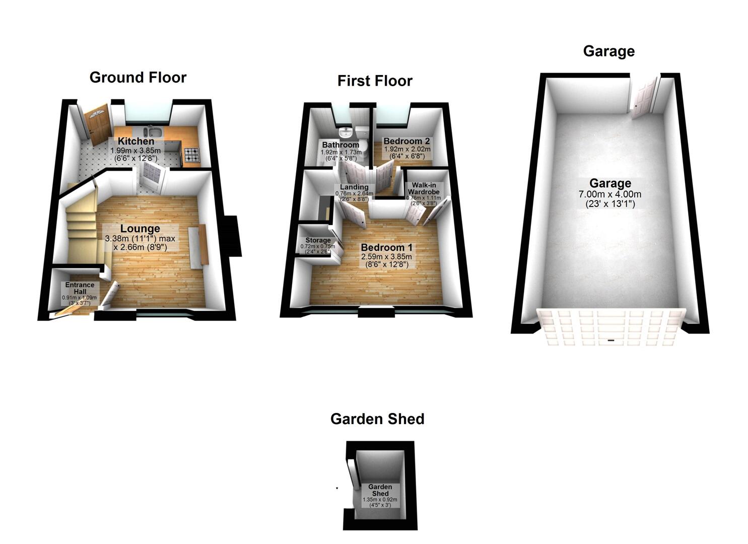 To the front a fully enclose pebbled courtyard with walkway to front door. To the rear paved patio area with shed (light and power / utility space) Lawn, fully enclosed paved patio perfect for summer evenings, access to metal detached garage with light and power and ample space to park your car, access to further garden behind garage. Outside light, outside water.