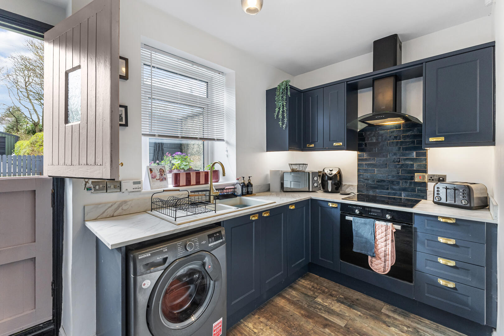Kitchen - 1.98m x 3.86m (6'6" x 12'8") - Laminate wood flooring, outlook to the rear, range of low and high level units with shaker style wood doors, laminate worktops and uprights, integrated Cooke and Lewis electric oven / grill, Cooke and Lewis 4 ring electric hob, extractor fan, tiled splashback, space for washing machine, ceramic 1 ? sink and drainer with mixer tap, contemporary style radiator, under stair storage, wooden barn door to rear garden.