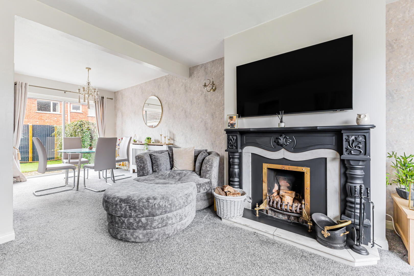Living/Dining - 7.34 x 4.24 (24'0" x 13'10") - Carpet, outlook to front, wall lights, feature open fire with wooden surround, slate and granite hearth with cast iron inset, Dining room with uPVC sliding patio doors to rear garden.