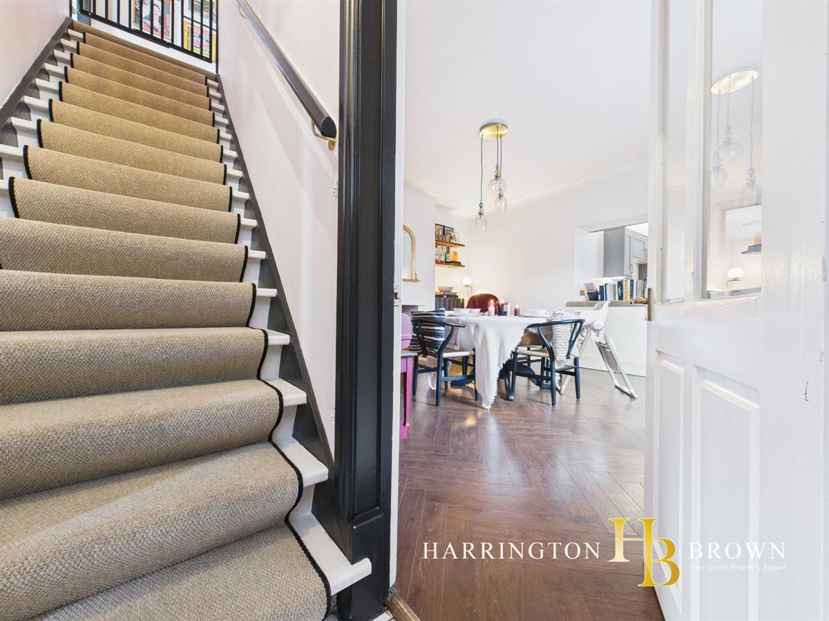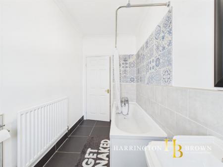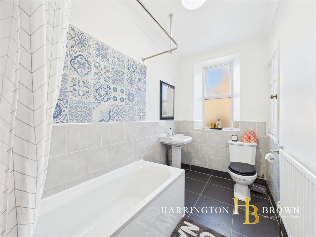 Heading up the stairs, a feature carpet stair runner leads to a family bathroom with a tiled surround, classic basin, and bath with a mains shower over. The second bedroom is generously proportioned and full of character, while loft access from the landing provides insulated storage. The master bedroom enjoys a stunning dual aspect, flooded with natural light, complemented by fitted classical wardrobes, overstair storage, and beautiful exposed wood flooring.