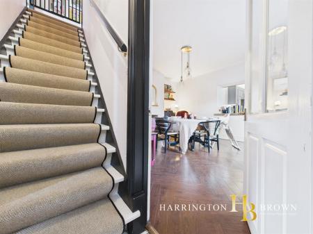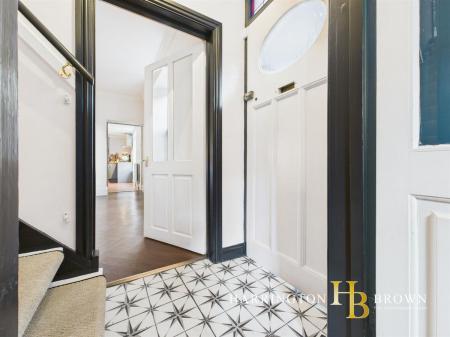 An entrance porch leads into a welcoming inner lobby, where a beautiful period front door and striking monochromatic tiling set a refined tone.