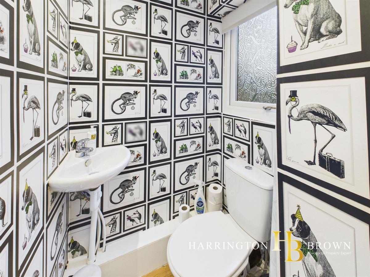 The heart of the home is the recently renovated kitchen/diner, thoughtfully designed with pale grey shaker-style units and integrated appliances. A breakfast bar provides casual seating, perfect for enjoying company while preparing meals. The dining/lounge area is bright and inviting, with doors that open out to the mature garden, blending indoor and outdoor living spaces effortlessly. A separate WC adds convenience for family and guests.