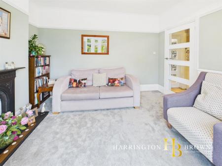 Upon entering, a welcoming hallway with high ceilings sets an airy tone, leading to the inviting lounge featuring a bay window that frames the pleasant surrounding views, alongside a charming feature fire, elegant coving, and a decorative ceiling rose that adds period character.
