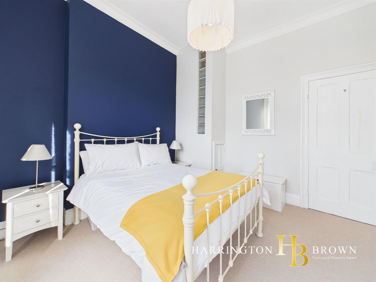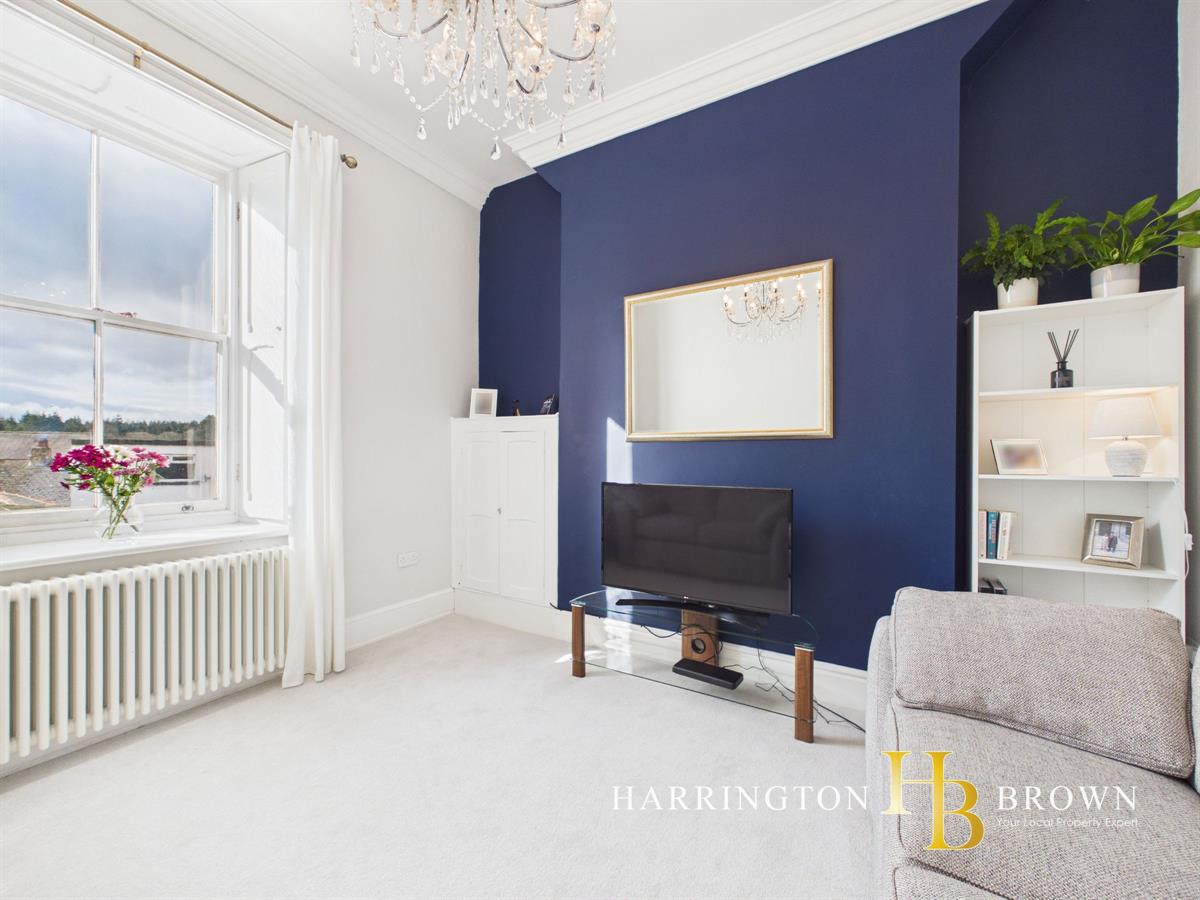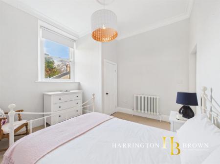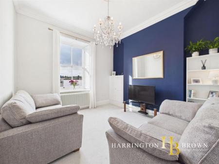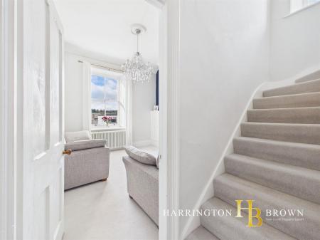 The property is set over several levels, with the entranceway occupying the ground floor. To the first floor, a welcoming lounge showcases high ceilings, a traditional sash window and a classic column radiator, all complemented by a soft pale grey carpet and elegant four-panelled doors that enhance the sense of heritage and refinement. The proportions feel generous and light, with a crisp, fresh d?cor that allows the period detailing to take centre stage.