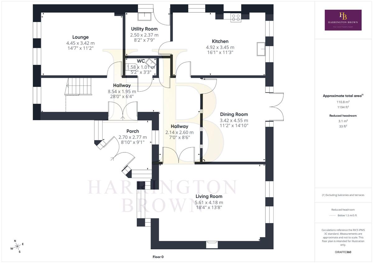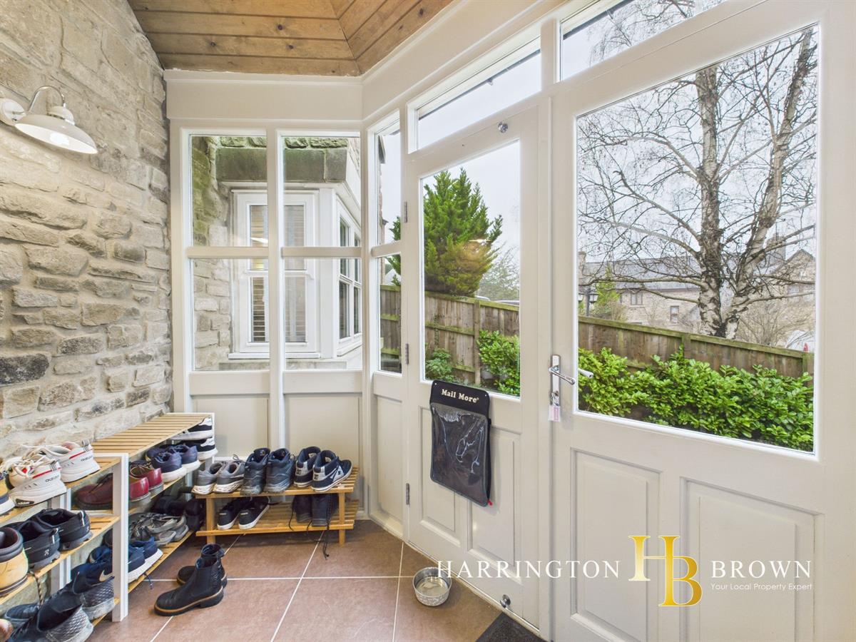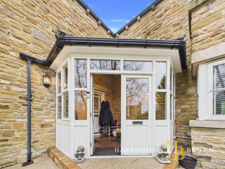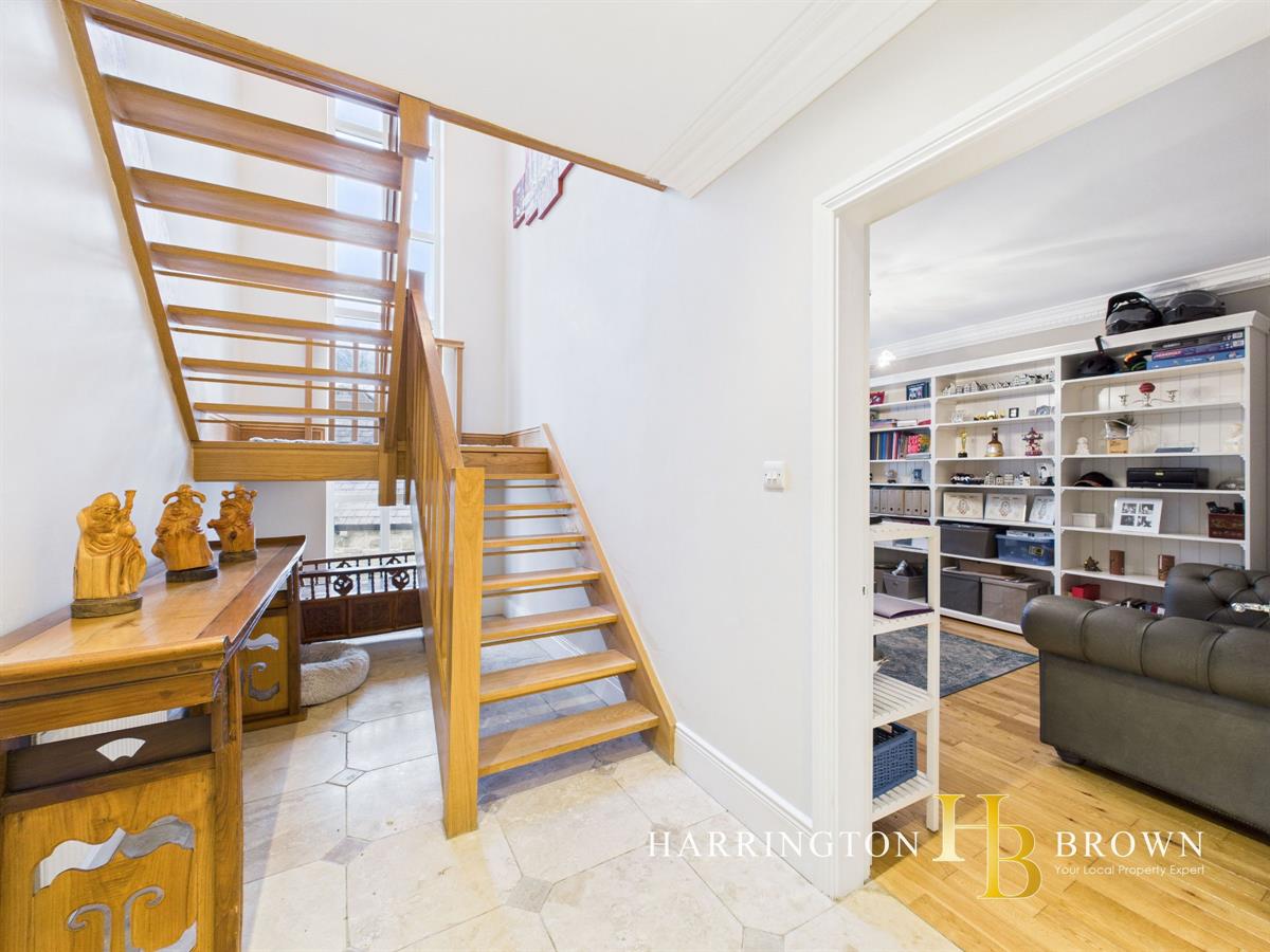 Upon entering, you're greeted by a characterful entrance featuring stone flooring and a striking stone feature wall. Glass doors open into a spacious hallway, bathed in natural light thanks to a stunning double-height window that creates an inviting and airy atmosphere.