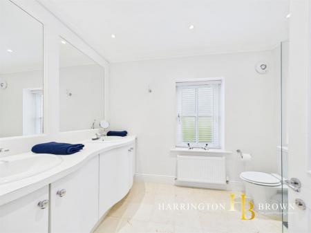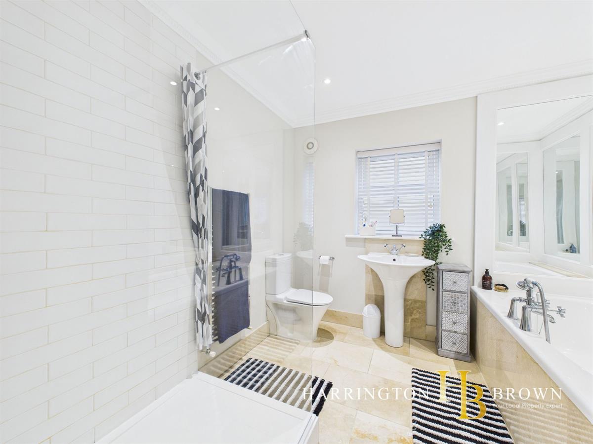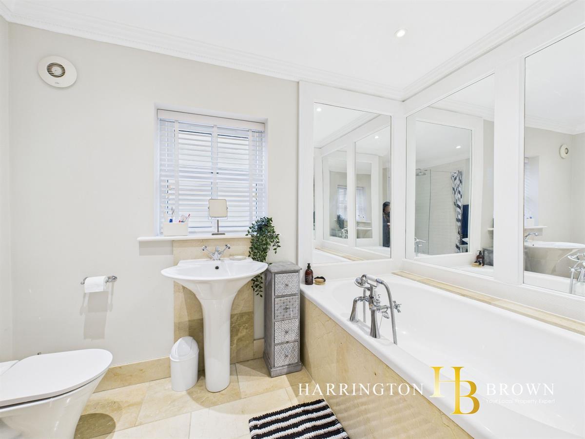 A modern oak staircase serves as a focal point, complemented by a large panel window that floods the landing with natural light. Upstairs, you'll find four spacious bedrooms. The luxurious master suite includes an en-suite featuring a large shower and double vanity unit, as well as a separate dressing room. The family bathroom exudes sophistication, with a large bathtub set within mirrored recesses, a walk in shower, pedestal sink, wc , stone flooring and a large practical storage cupboard. The landing provides access to the fully insulated, boarded loft with potential for further extension.