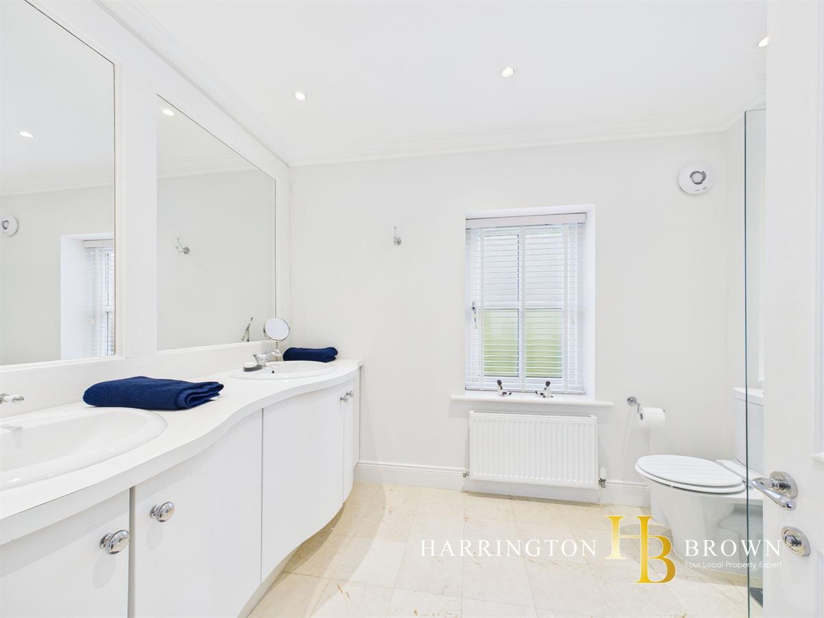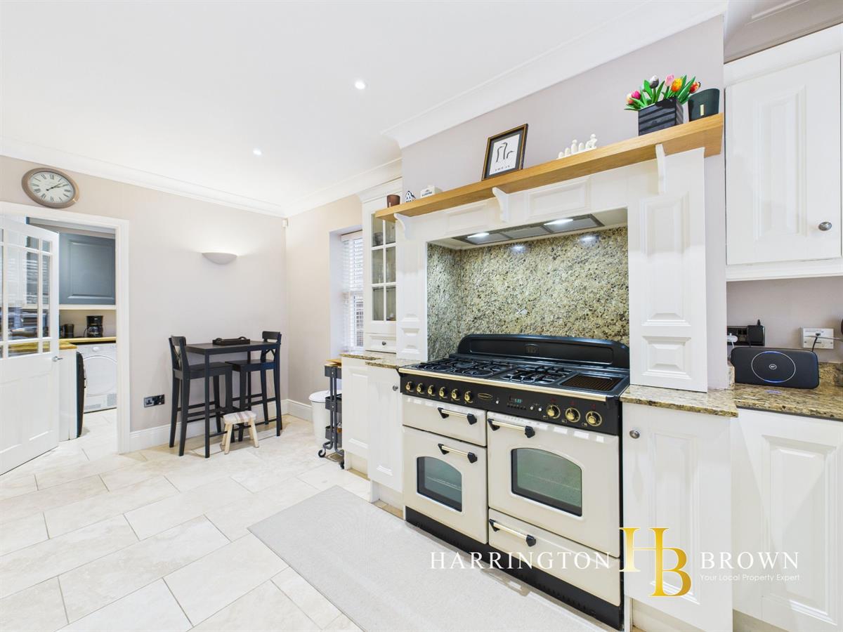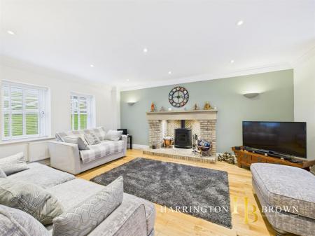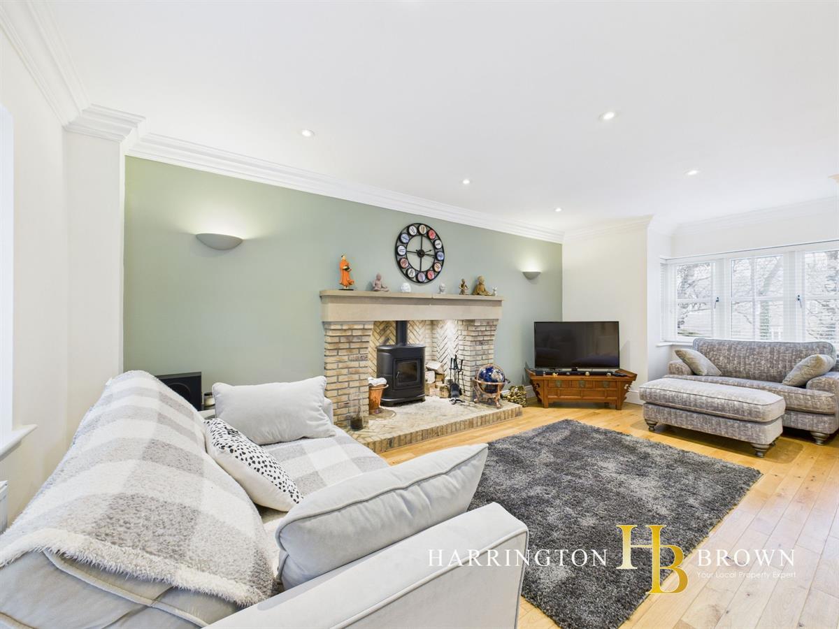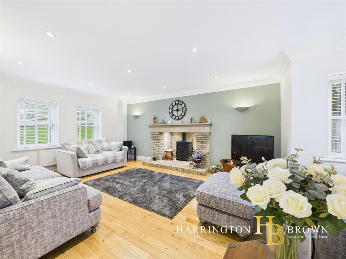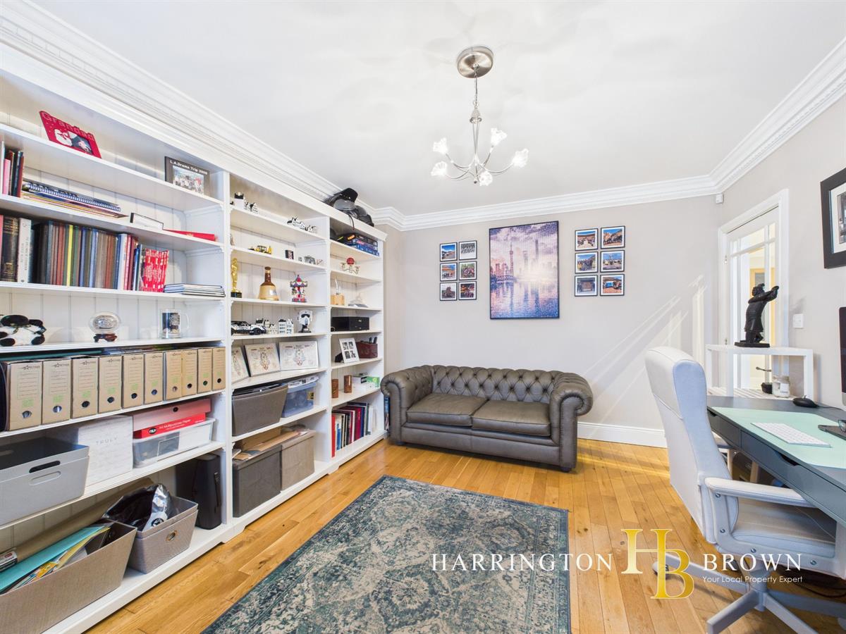 The generous lounge boasts dual aspects with oak flooring and a charming brick fireplace complete with a log burner-perfect for cosy winter evenings. The traditional-style kitchen is well-appointed with marble worktops, a range cooker, integrated fridge/freezer, and a breakfast area. Adjacent is a practical utility room with fitted wall and base units. The dining room has French doors that seamlessly connect to the patio, making it an excellent space for outdoor entertaining. A further reception room is currently used as a home office but could also be used to create a 5th bedroom. Completing the ground floor is a sizable cloakroom cupboard and WC are conveniently located near the entrance.