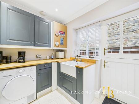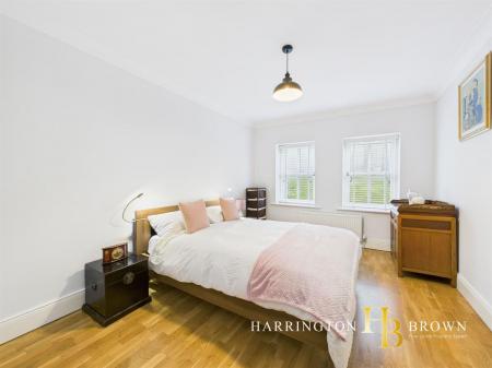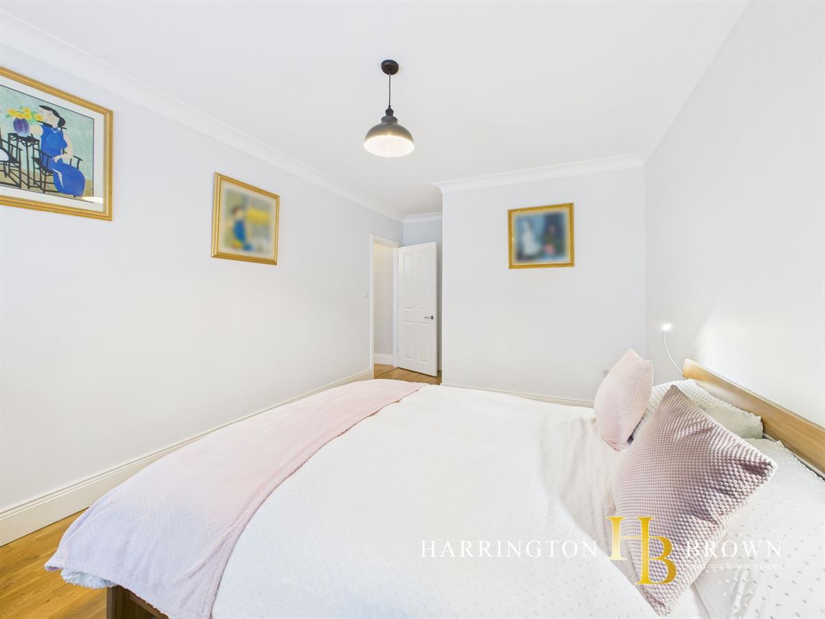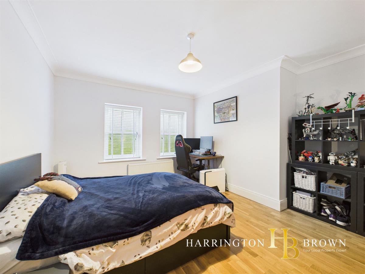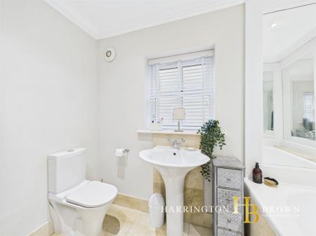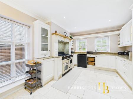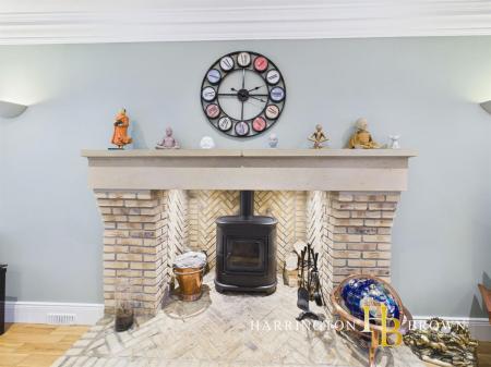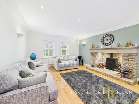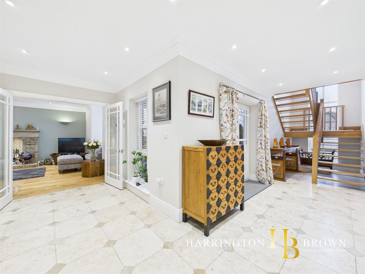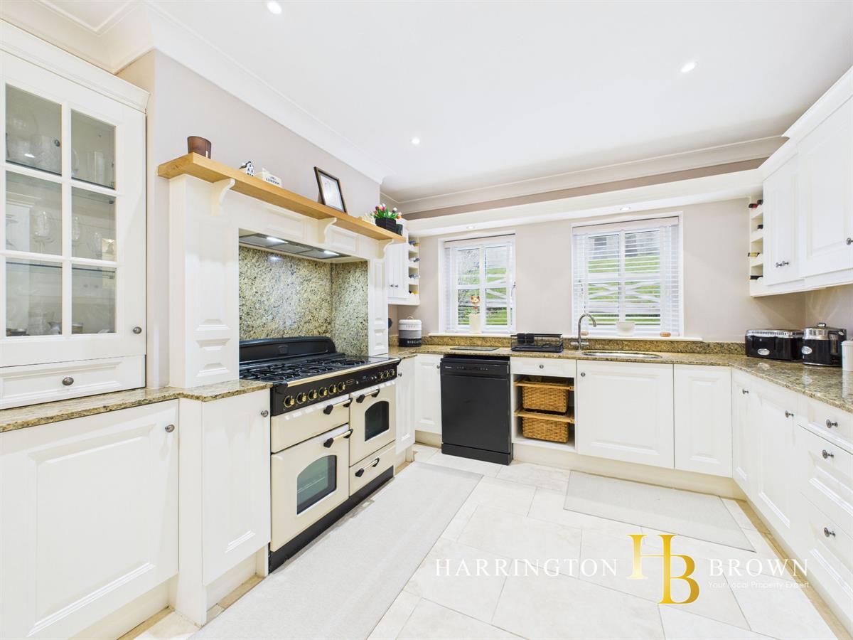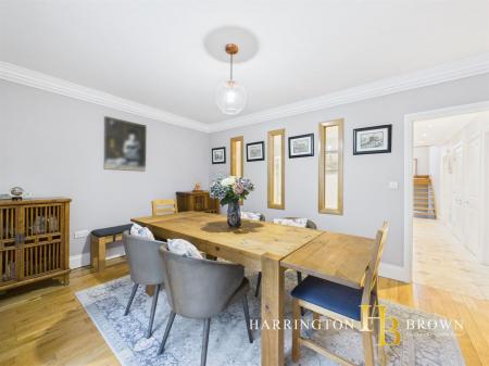 The generous lounge boasts dual aspects with oak flooring and a charming brick fireplace complete with a log burner-perfect for cosy winter evenings. The traditional-style kitchen is well-appointed with marble worktops, a range cooker, integrated fridge/freezer, and a breakfast area. Adjacent is a practical utility room with fitted wall and base units. The dining room has French doors that seamlessly connect to the patio, making it an excellent space for outdoor entertaining. A further reception room is currently used as a home office but could also be used to create a 5th bedroom. Completing the ground floor is a sizable cloakroom cupboard and WC are conveniently located near the entrance.