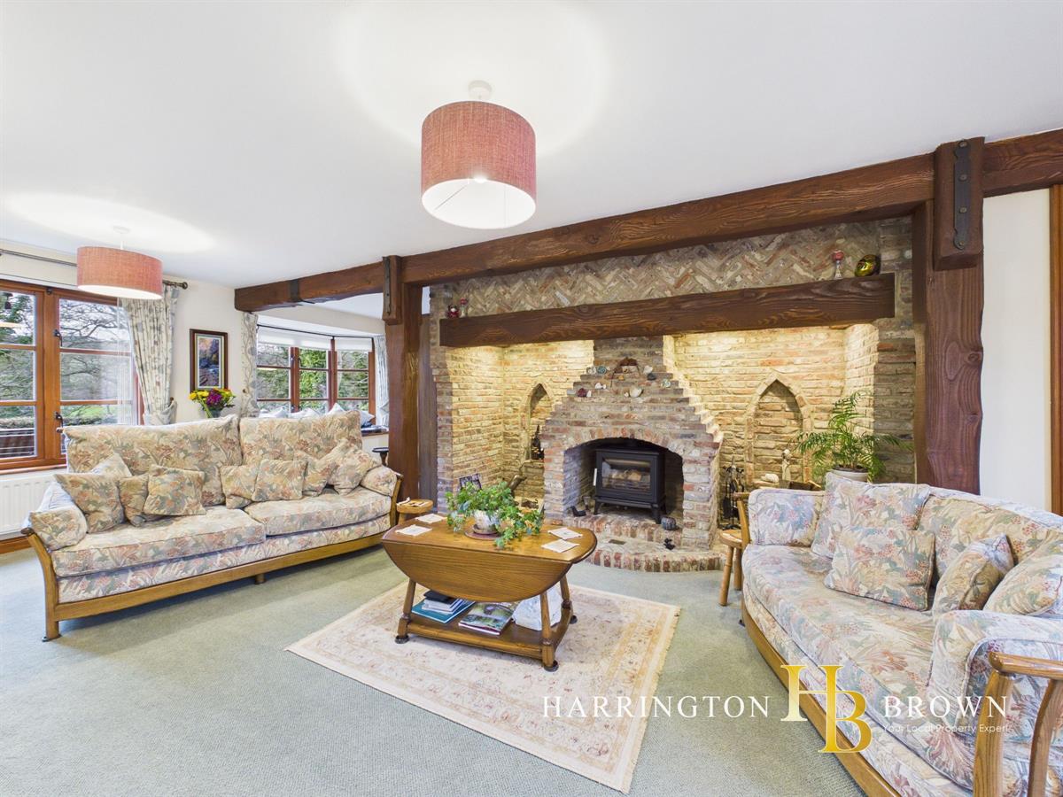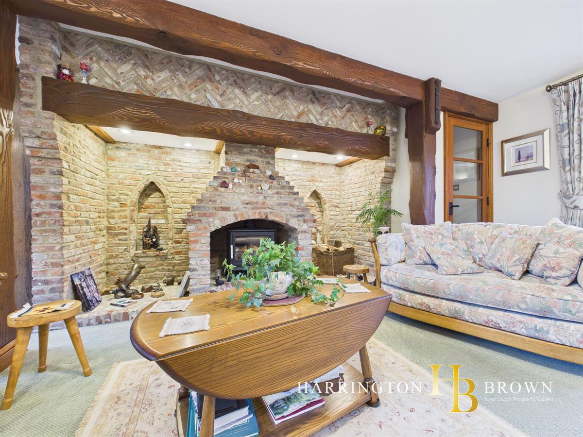 The lounge is a stunning space, centred around a breathtaking fireplace with log burner inset. The brickwork is laid in a herringbone pattern across the top of the mantle, showcasing thoughtful craftsmanship, while two window shaped alcoves add charm and architectural interest.