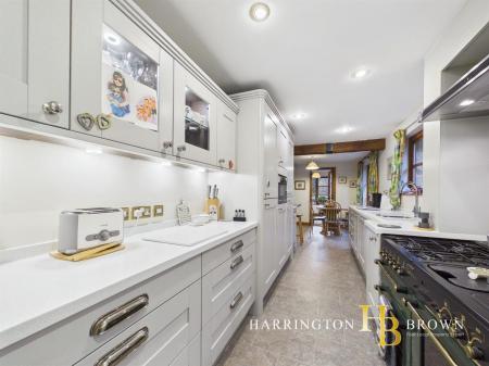 From the dining room, the home continues into a well appointed breakfasting kitchen with additional dining space, which in turn leads to a snug. The snug is a wonderfully serene room, ideal for reading, hobbies or simply unwinding in peace whilst overlooking the gardens and river. The kitchen itself comprises elegant shaker style units in a neutral, calming tone, paired with quartz work surfaces that perfectly complement the cabinetry. A Rangemaster oven with gas hob adds a sense of quality and permanence, alongside a range of integrated appliances including microwave, fridge freezer and dishwasher. Off the kitchen is a practical utility room for plumbed appliances, ideal as a laundry space, complete with external door, perfect for removing muddy boots after countryside walks. Access is also provided to the integral garage.