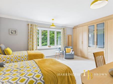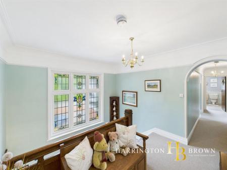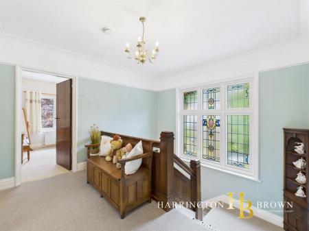 Ascending the stairs, the landing is bathed in natural light streaming through the large stained glass window. Upstairs, three spacious bedrooms await, each offering tranquil garden views, privacy, and the convenience of fitted storage. The fourth bedroom, currently utilised as a guest room, provides access to a generously sized ensuite bathroom featuring a separate shower and a vanity sink unit. Completing the first floor is the family bathroom, showcasing a modern design highlighted by a freestanding bath, shower, heated towel rail, and his-and-hers vanities, along with a separate WC for added convenience.