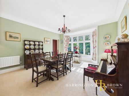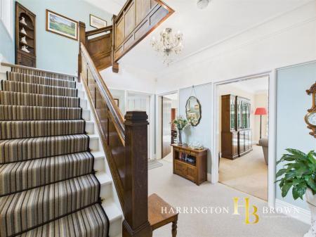 Upon entering, a grand hallway welcomes you with a striking stained glass window and an oak panelled staircase leading to the upper level. To the right, a formal lounge bathed in natural light from dual-aspect windows and a generous bay offers serene views of the lush grounds, setting the stage for the property's luxury ambiance. The adjacent dining room, also overlooking the gardens, flows gracefully into a delightful garden room with sliding doors opening onto a charming patio area. The recently renovated kitchen boasts sleek, modern design with granite countertops and integrated appliances, while a convenient laundry room and a WC offer practical amenities for everyday living. At the foot of the stairs, an elegant cloakroom offers both style and functionality, leading to a separate WC.