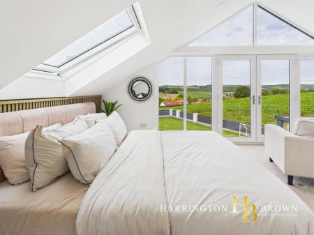 Ascending to the upper level reveals a breathtaking master suite, perfectly positioned to capture far-reaching views of the surrounding countryside through fully glazed apex windows and French doors, with potential to add a Juliette balcony. Remote-controlled Velux windows, a walk-in wardrobe and a beautifully appointed en suite with statement tiling complete this stunning retreat.
