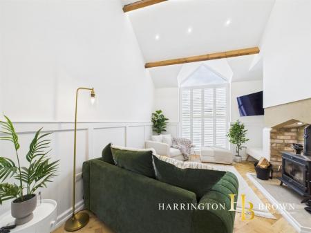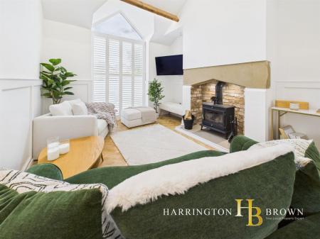 To the front lies a beautiful lounge, finished with herringbone flooring, vaulted ceiling and an apex window. The inglenook fireplace with exposed brickwork, stone lintel and log burner provides a warm focal point, blending character with modern style. The entry level also offers three well-proportioned bedrooms and a luxurious family bathroom, complete with freestanding bath, separate shower, vanity basin, tiled finish and the comfort of electric underfloor heating.