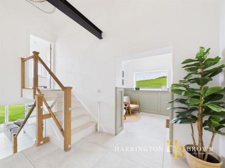 The property is approached via a generous block-paved driveway, with a smart rendered exterior and a paved seating area creating a welcoming first impression. Stepping inside, a striking entrance hall sets the tone with statement shaker panelling, tiled flooring with underfloor heating and a side window framing the surrounding countryside, while a glazed balustrade stairway floods the space with natural light.
