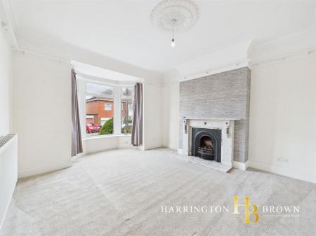 Step into the inviting lounge, featuring a stunning bay window that floods the room with natural light, complemented by elegant ceiling roses and picture rails. A beautiful marble fire surround houses a cosy gas fire, perfect for relaxing evenings.