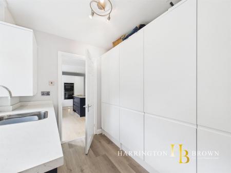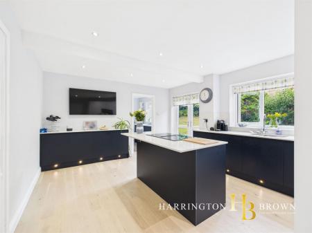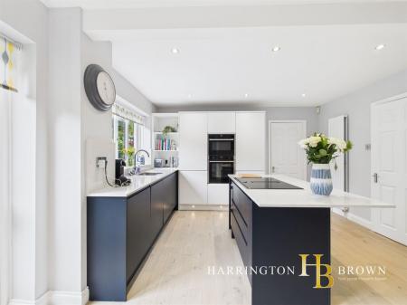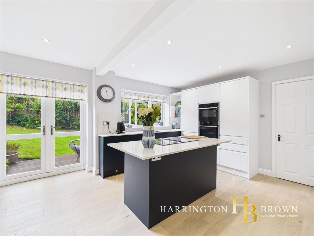 At the heart of the home, the kitchen impresses with its contemporary dual-tone cabinetry, Quartz work surfaces, central island, and a comprehensive range of integrated appliances including dishwasher, twin ovens, microwave, and induction hob. With space for dining and additional French doors framing garden views, this is a room designed for both everyday living and social occasions. A separate utility room provides additional storage, appliance space, and external access, and houses the Worcester gas combi boiler.