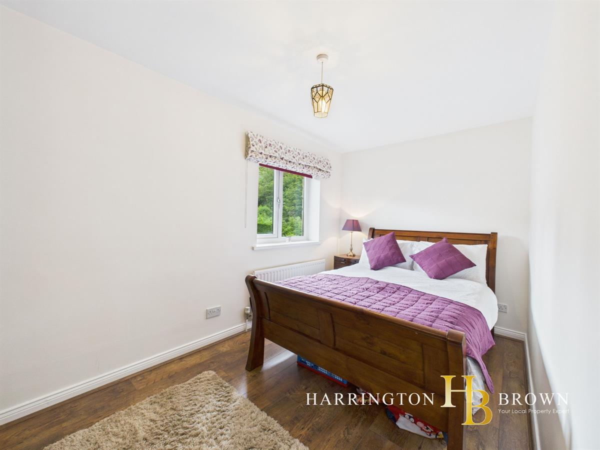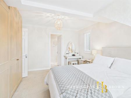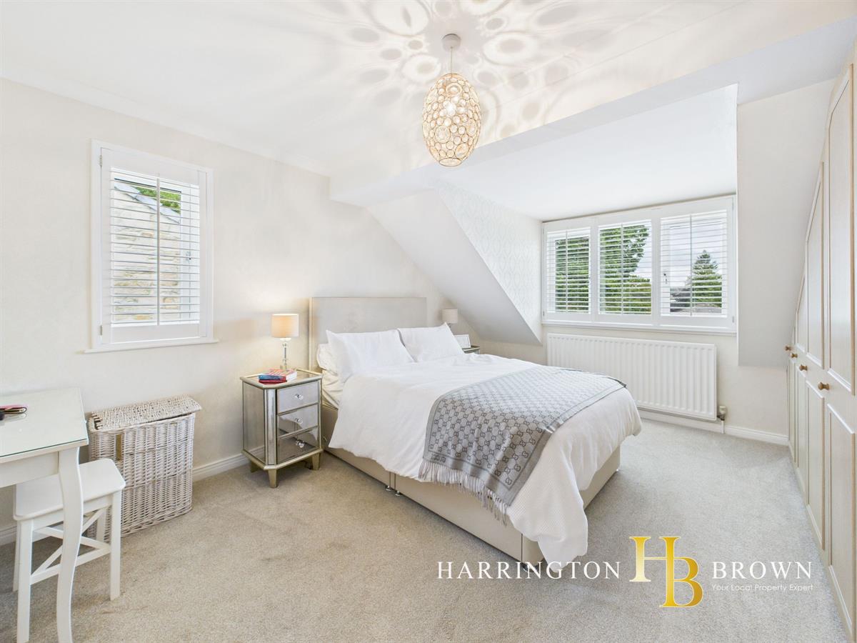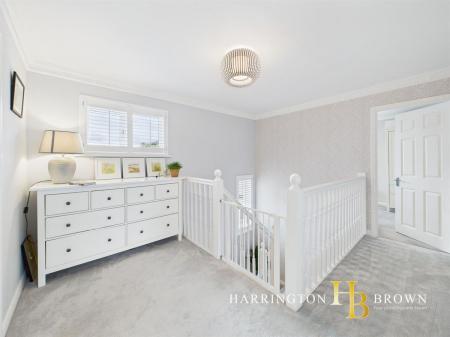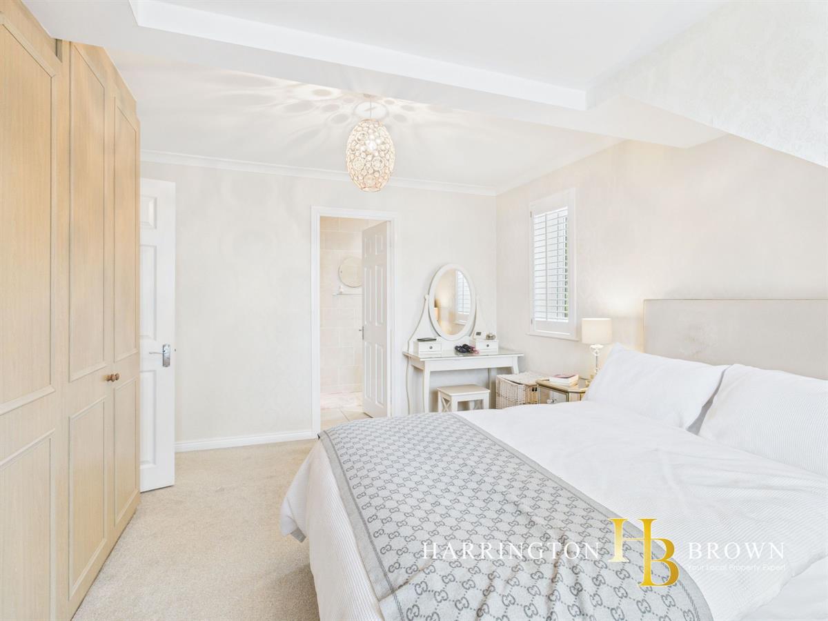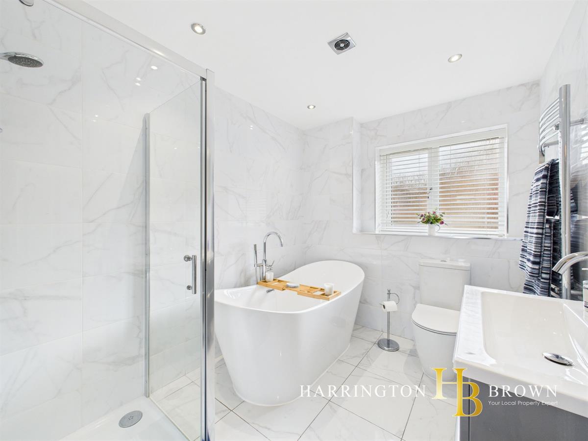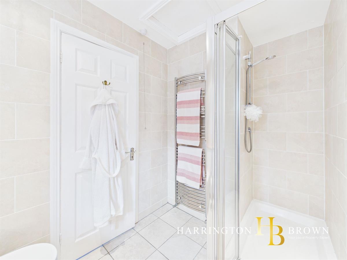 The first floor is arranged around a generous landing. The principal bedroom features a dormer window, fitted wardrobes, and an en-suite shower room finished with full tiling and a walk-in enclosure. Three further double bedrooms provide excellent versatility, while the family bathroom adds a touch of indulgence with its free-standing bath, tiled surround, and separate electric shower.