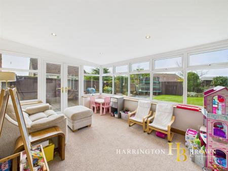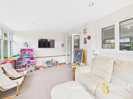 To the rear, the bright and inviting sunroom enjoys a lovely aspect over the garden and features inset spotlights and a recently renewed roof, installed approximately two years ago. The garden itself has been landscaped to provide a level, usable space with a generous decked terrace - perfect for relaxing or dining outdoors, while its east-facing position ensures plenty of natural light and evening sunsets.