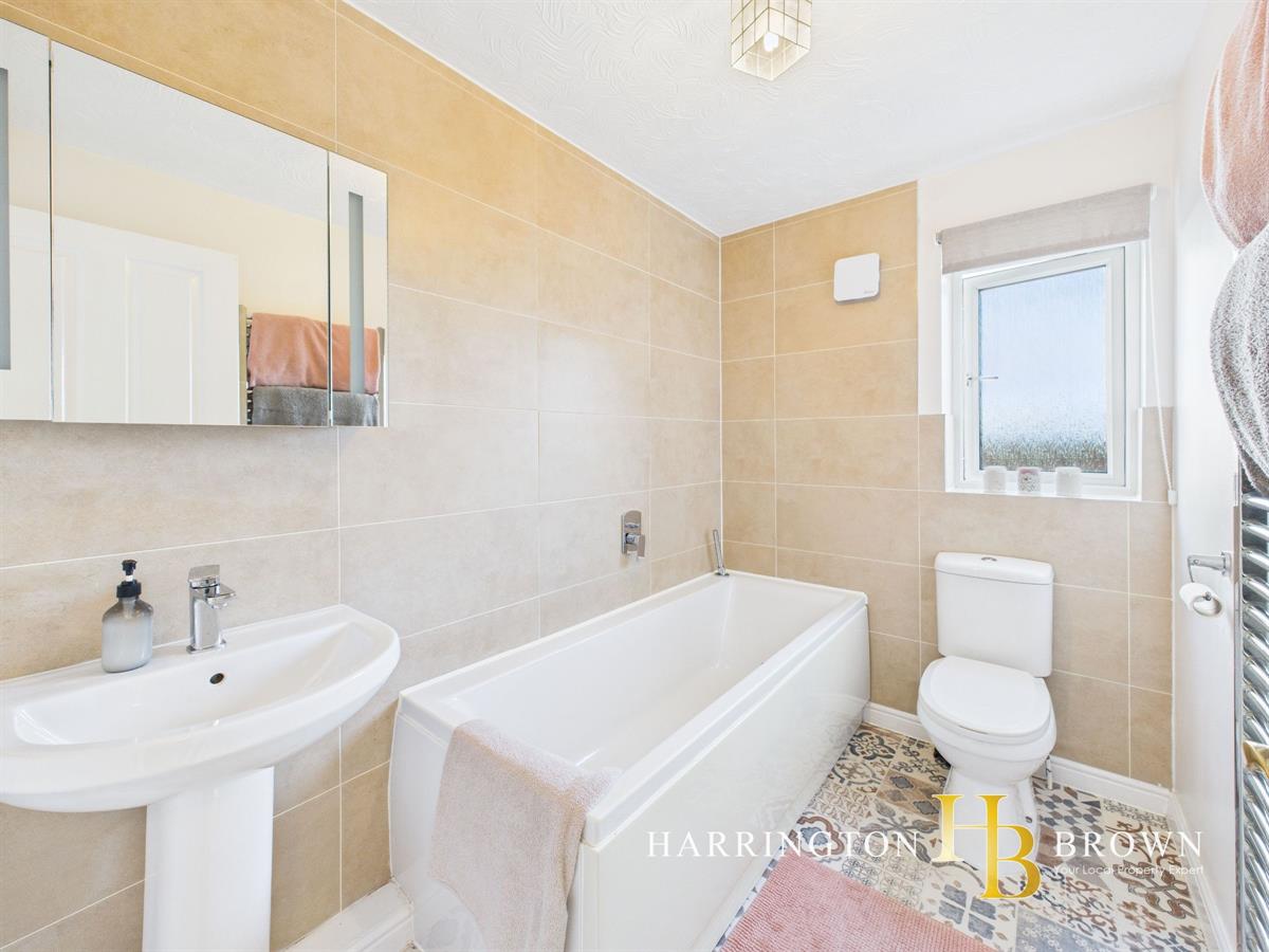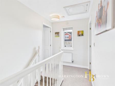Upstairs, a spacious landing gives access four bedrooms, one of which is currently used as a home office. The master bedroom benefits from en-suite facilities including a shower, WC, and pedestal wash basin, while the fitted wardrobes complement the room perfectly and are included in the sale. Bedrooms three and four enjoy lovely outlooks towards open countryside. The family bathroom has a smart, tiled finish and comprises a bath with shower over, WC, wash basin, and chrome heated towel rail. From the landing, there is also access to a large storage cupboard, ideal for added convenience and additional storage needs.