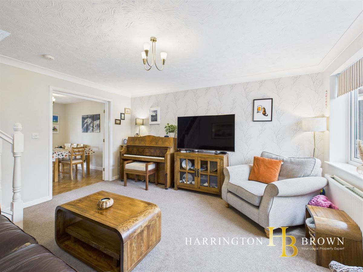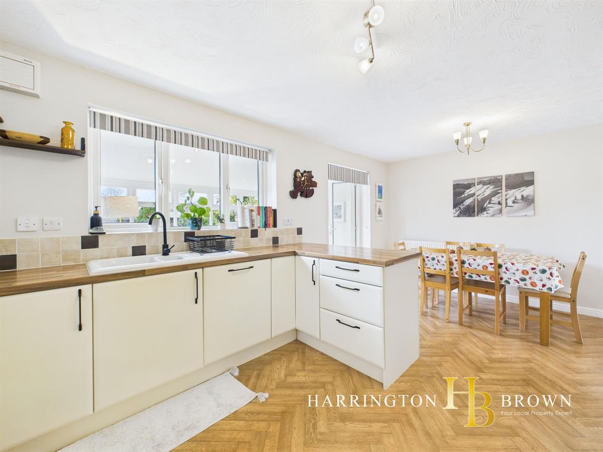 Upon entering the property, you are greeted by a practical entrance vestibule with space for coats and shoes before stepping into the cosy lounge, a comfortable room featuring coving, a large window to the front, and stairs rising to the first floor. From here, double doors lead through to the dining area, which flows seamlessly into the kitchen, creating a sociable open-plan space ideal for everyday living and entertaining. The kitchen is well equipped with an integrated oven and dishwasher, along with space for a freestanding fridge freezer, which can remain.