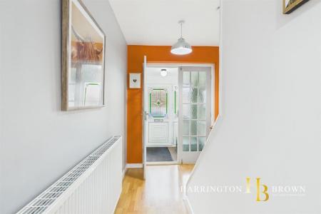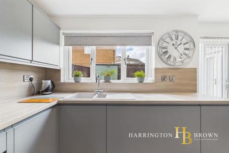 The kitchen has been stylishly updated in recent years, installed circa 2021, and offers a contemporary range of grey units complemented by integrated appliances including fridge freezer, oven, washing machine and dishwasher. A useful pantry cupboard provides additional storage, while there is also space for informal dining. French doors from the kitchen lead out to the rear garden, making it a practical and sociable space for everyday use.