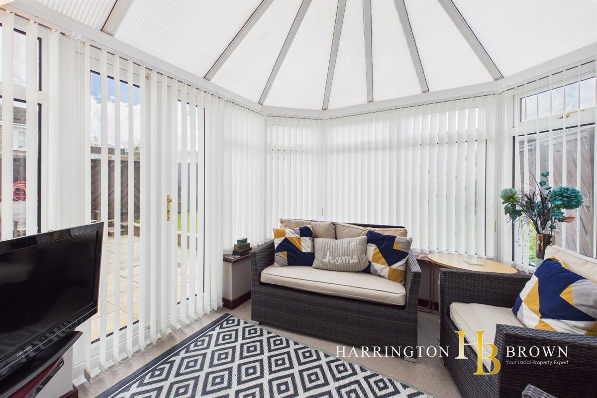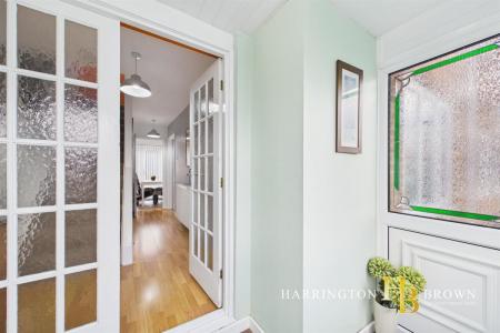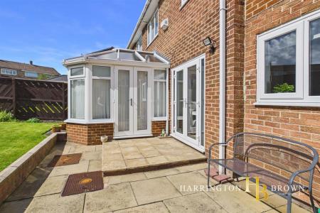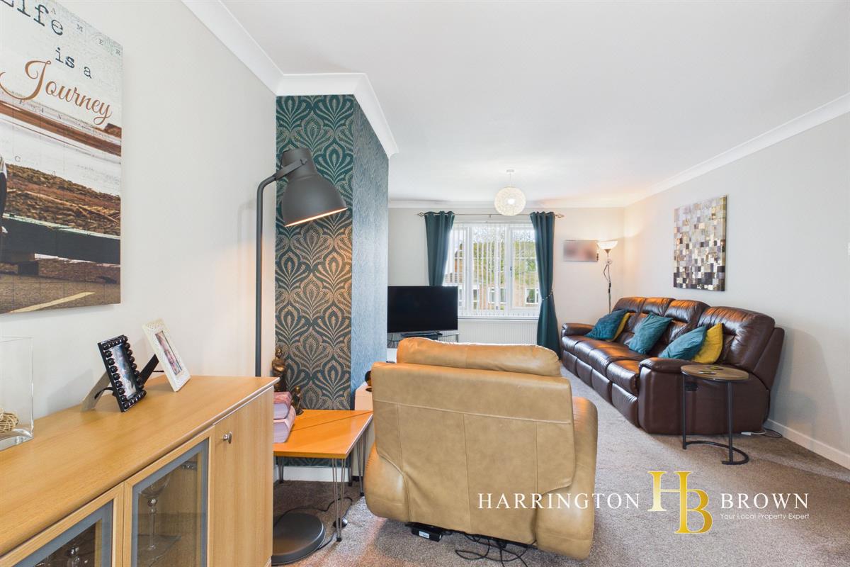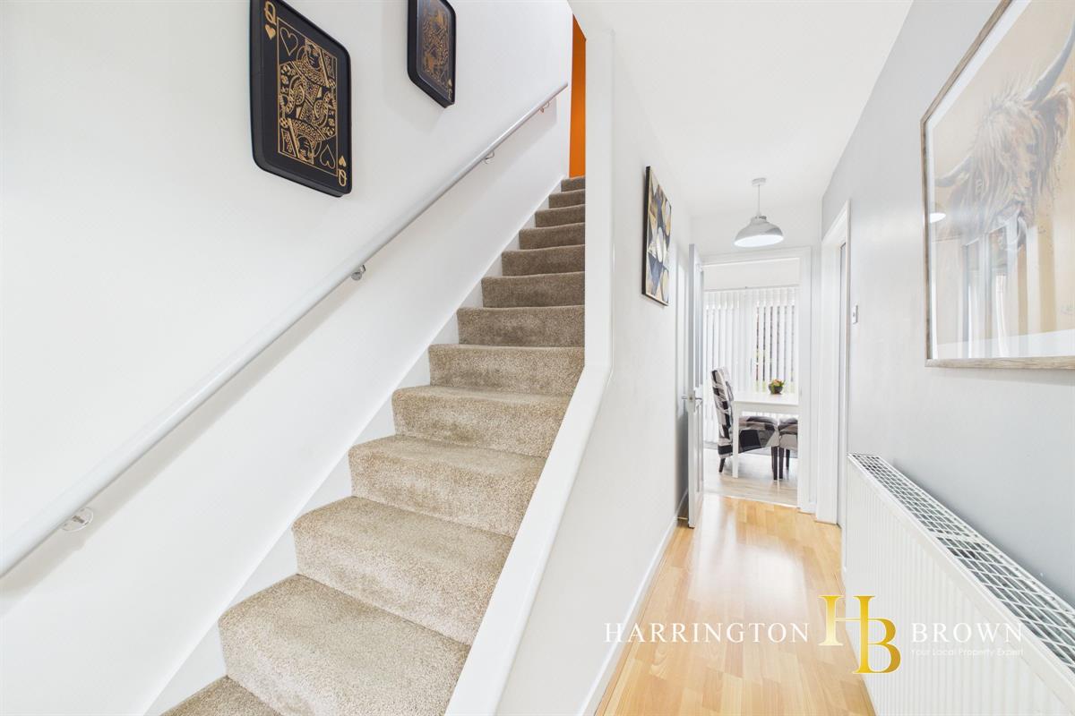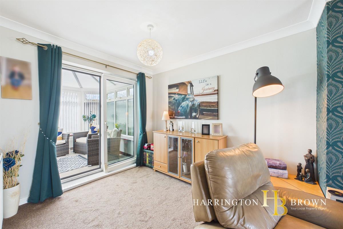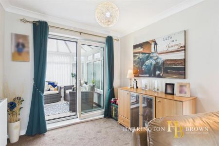 Upon entering, a bright glazed door with side lights opens into a welcoming inner hallway, where stairs rise to the first floor and doors lead through to the main living areas. The lounge and dining area form a spacious open plan reception room, ideal for modern family life and entertaining, with a seamless flow through to the conservatory at the rear. The conservatory enjoys a pleasant outlook over the garden and features French doors opening directly onto the patio, enhancing the connection between indoor and outdoor living.