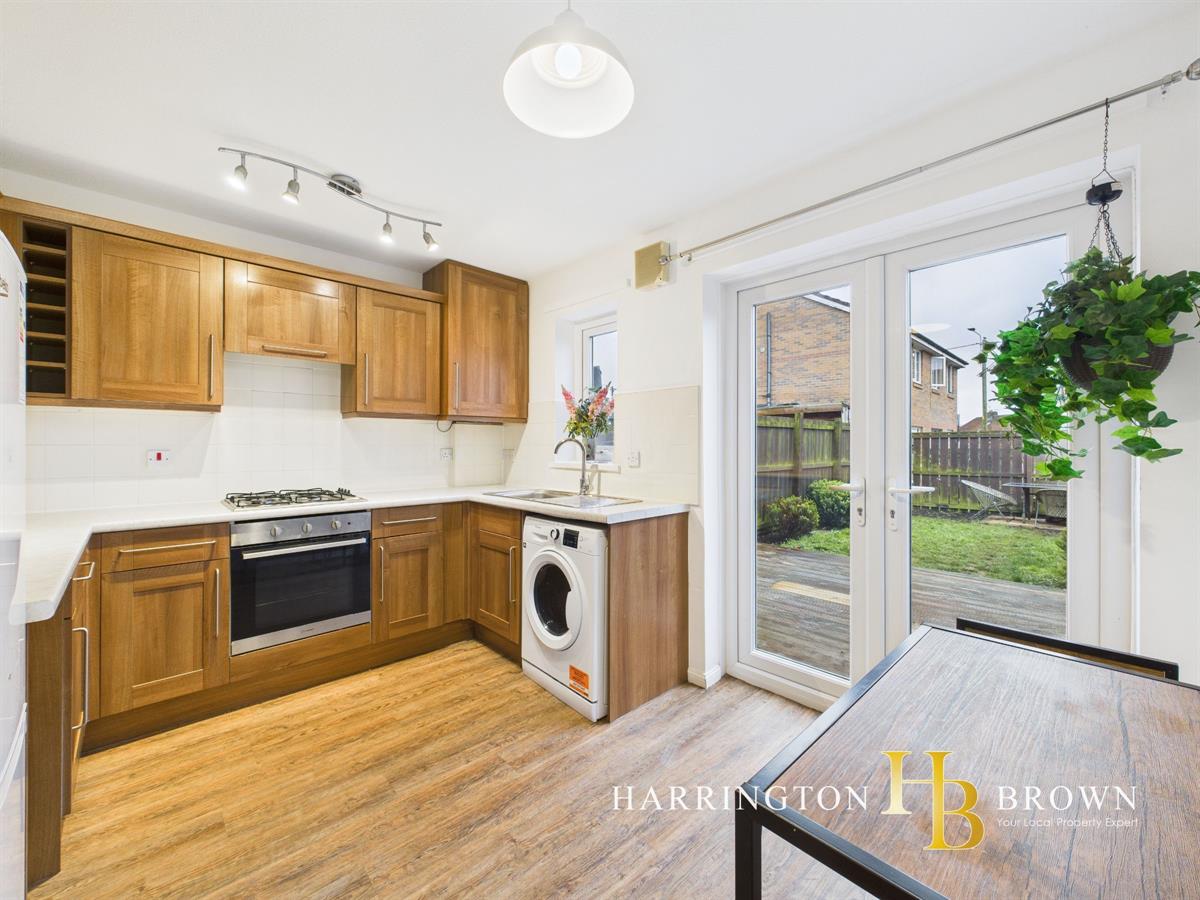 Inside, the ground floor features laminate flooring and includes a lounge and kitchen with dining space, while upstairs there are two bedrooms and a family bathroom with a white suite. The kitchen includes a range of wall and base units, workspace, tiled splashback, integrated oven, gas hob, extractor hood, and space for additional appliances. French doors lead from the kitchen to the rear garden, which offers scope to develop a welcoming outdoor area for relaxing or entertaining.