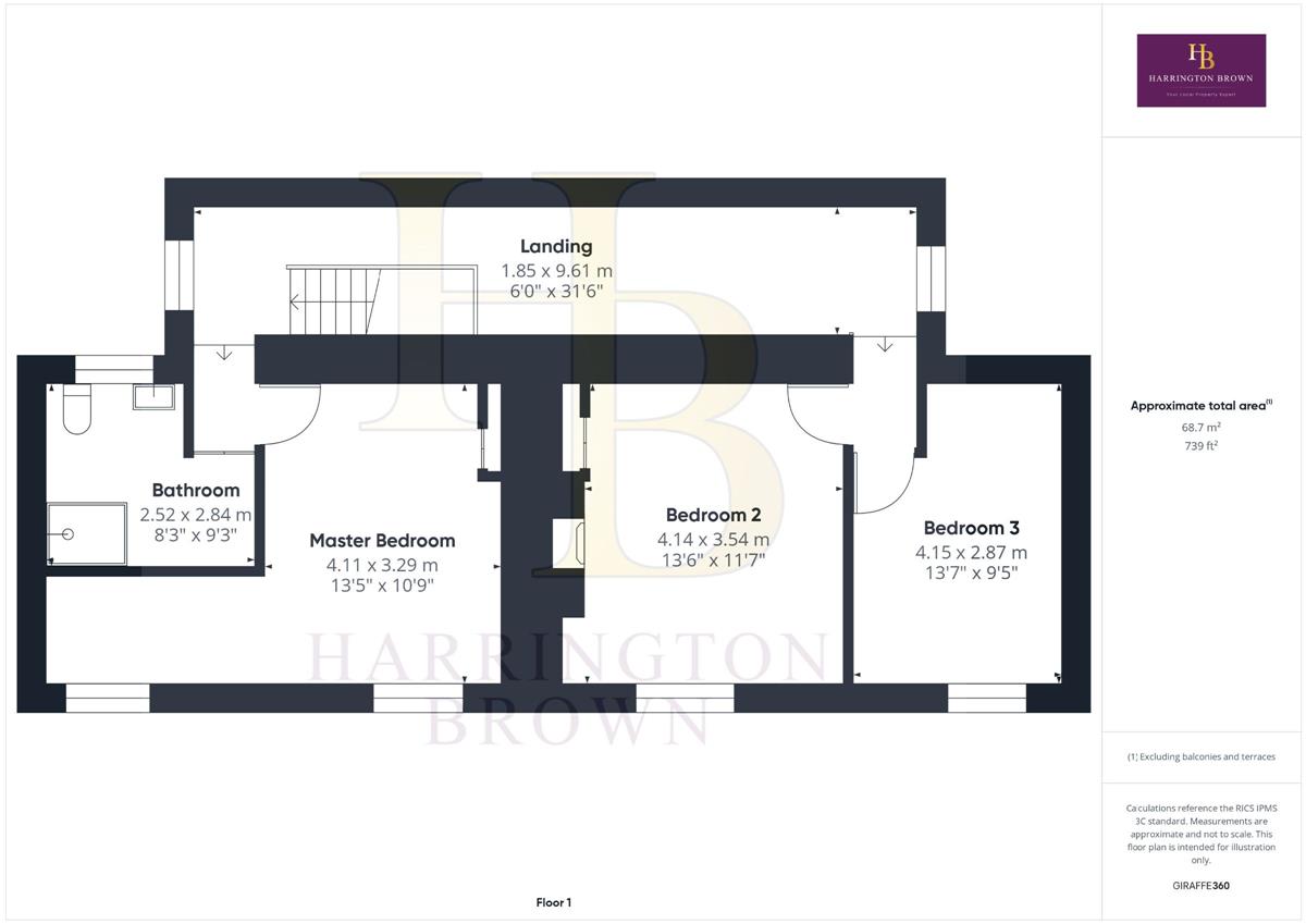 Landing w: 1.85m x l: 9.61m (w: 6' 1" x l: 31' 6")
