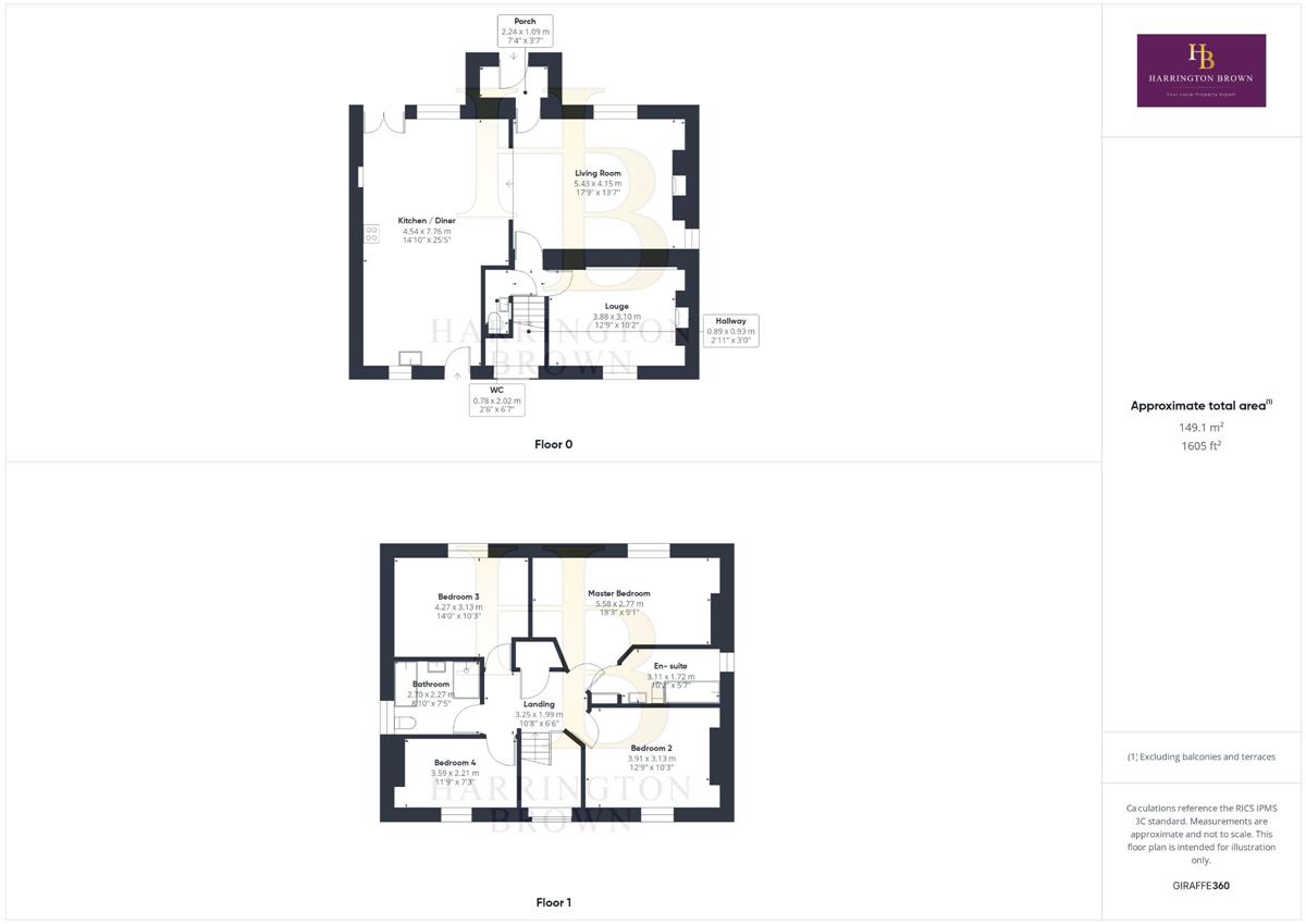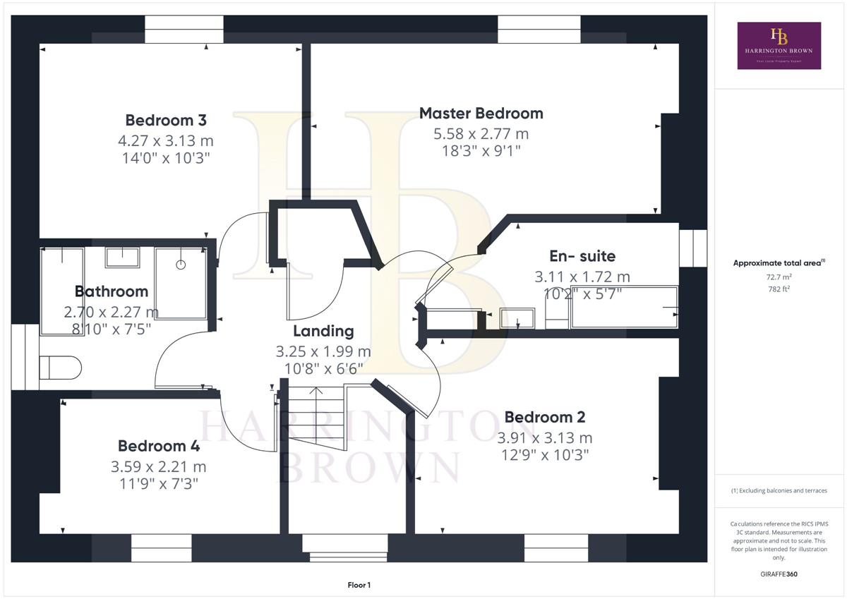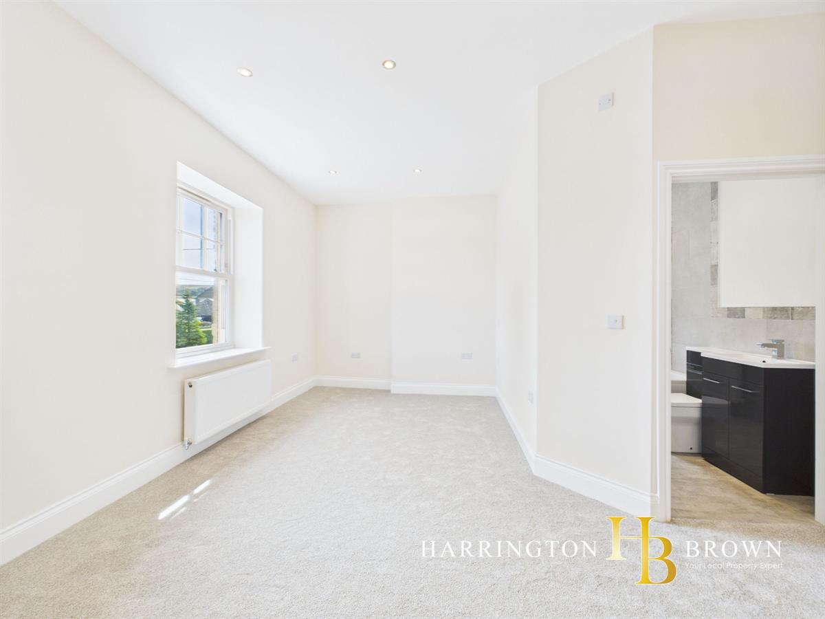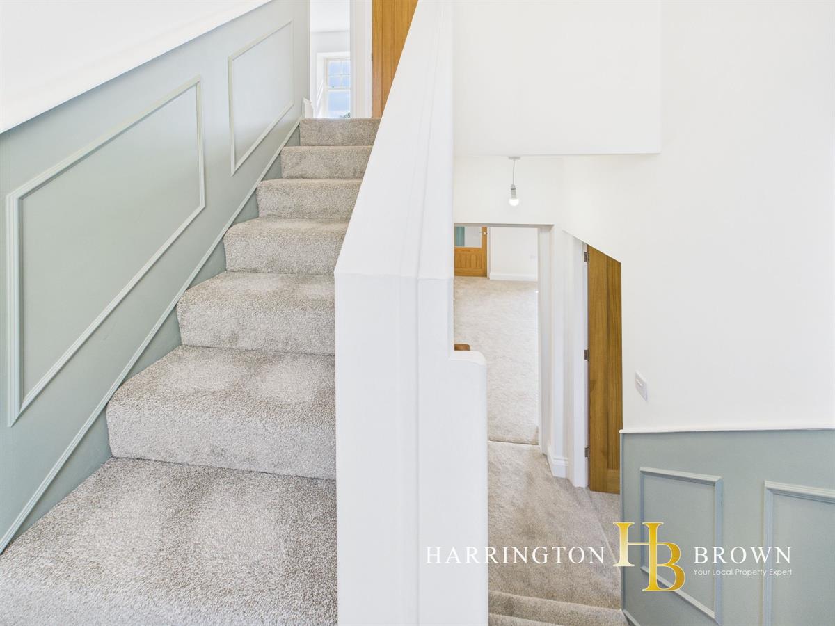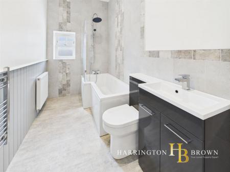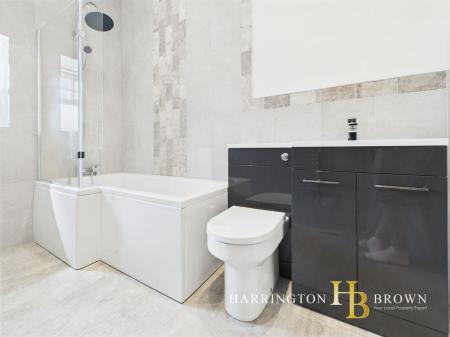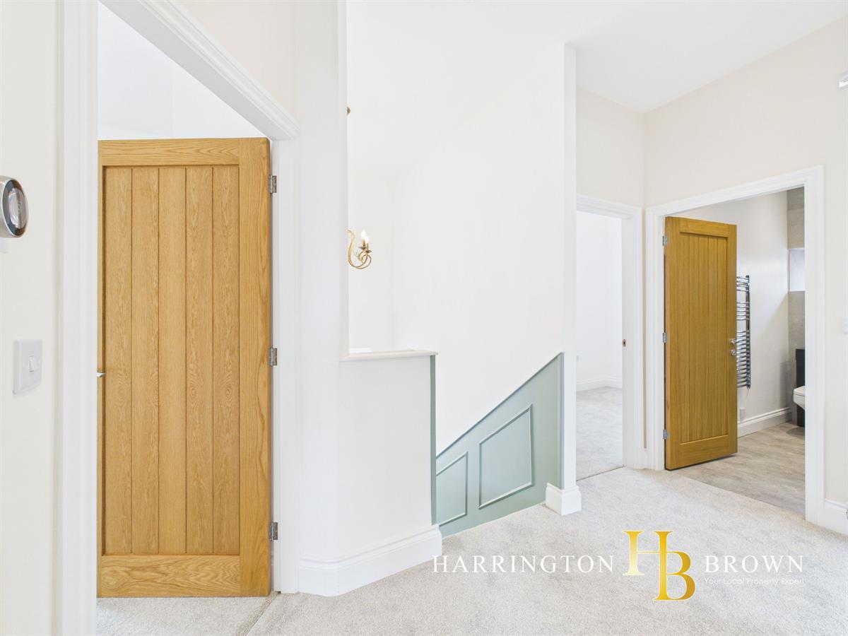 Four well-proportioned bedrooms are arranged from here, the master complete with a stylish en-suite featuring a P-shaped bath with dual-head rainfall shower, vanity unit, and wainscot panelling. The family bathroom is equally luxurious, with a freestanding bath, large walk-in rainfall shower, traditional fixtures, and a vanity basin.