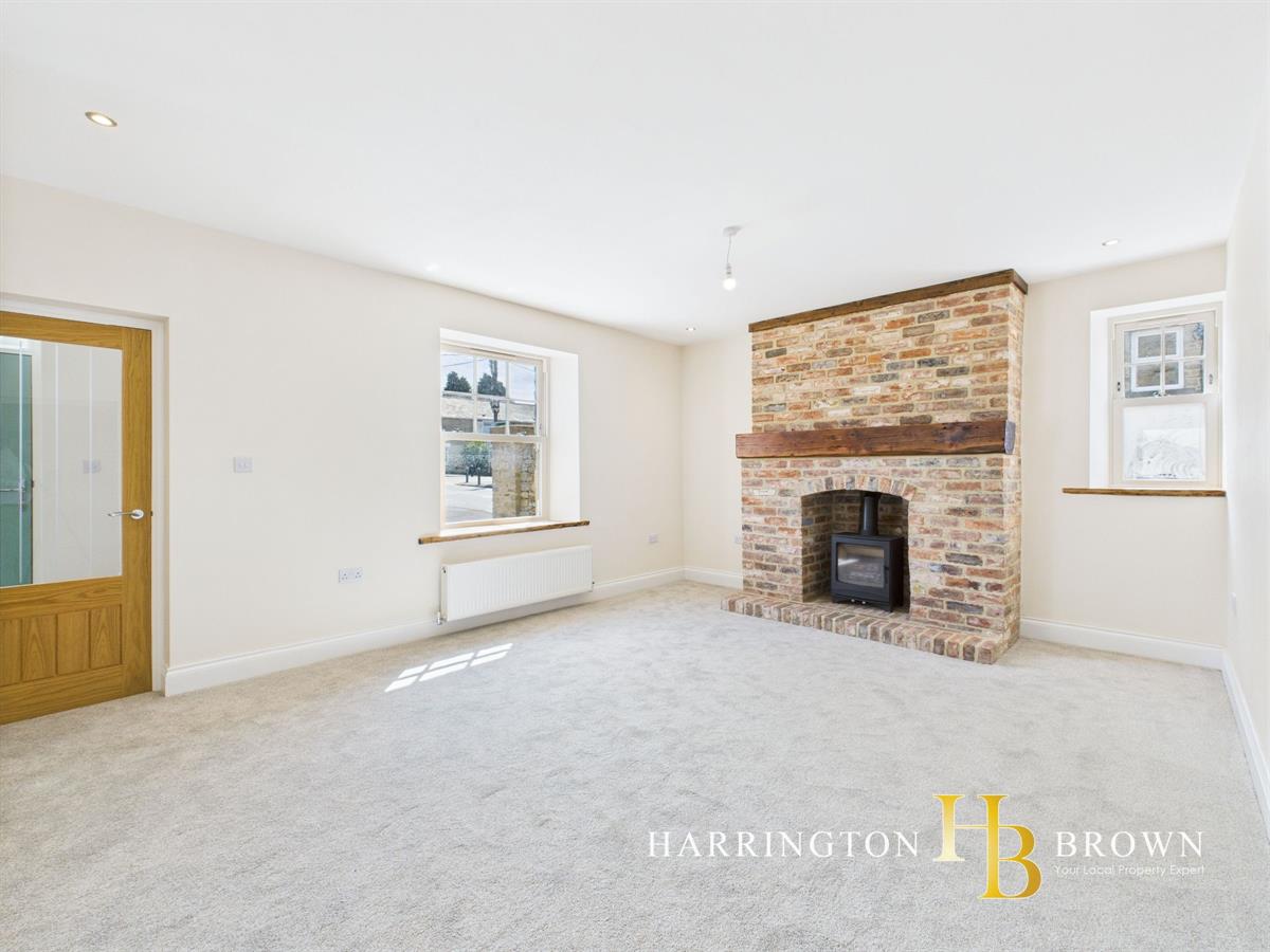 An inviting vestibule opens through a glazed oak door into the lounge, where oak windowsills, an exposed brick chimney breast with log burner, and a rustic timber mantle create a cosy focal point, complemented by natural light from both front and side windows. A small stair leads to the dining area with herringbone flooring and French doors onto the garden, ideal for entertaining.