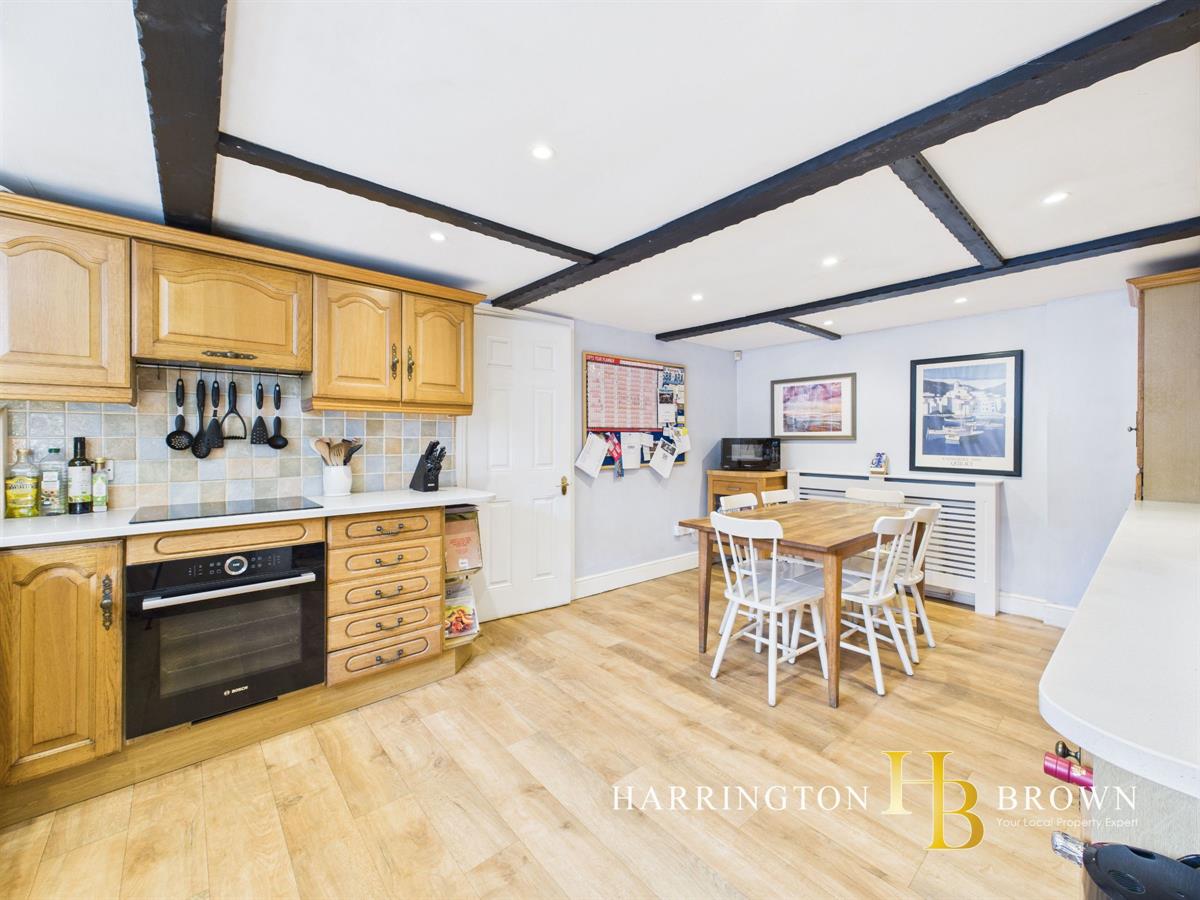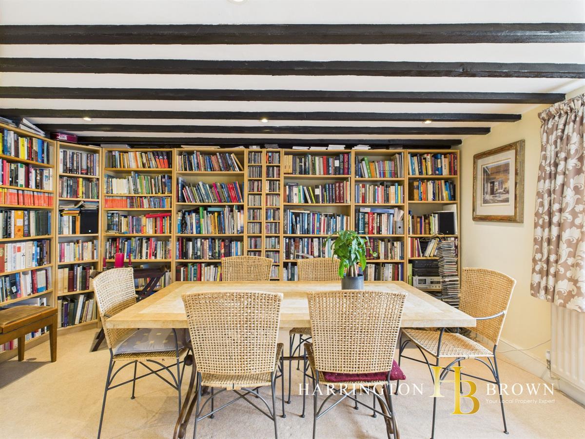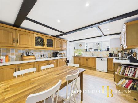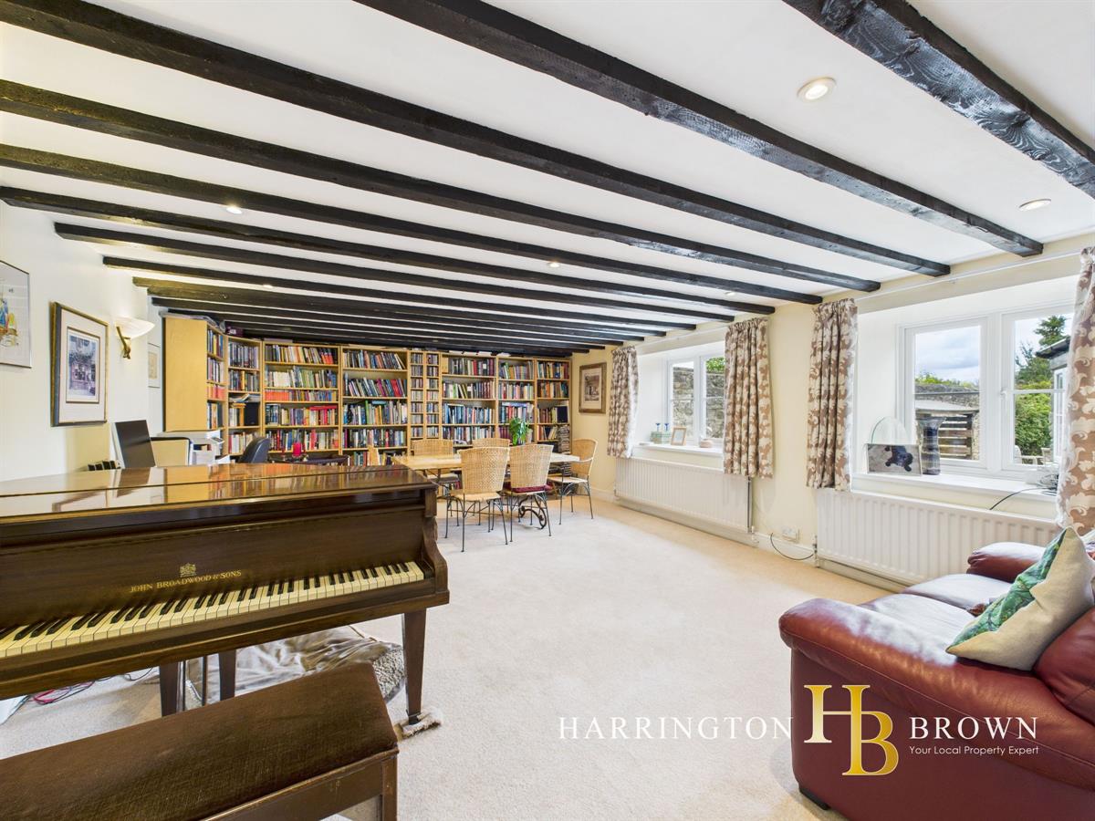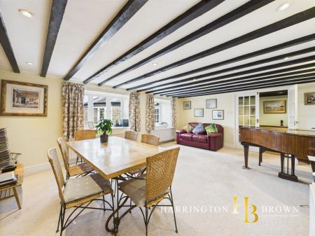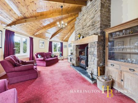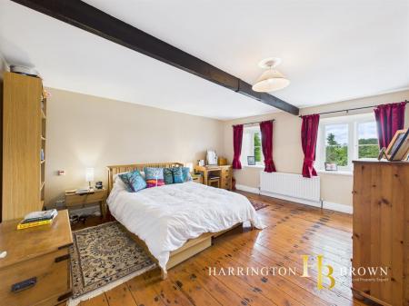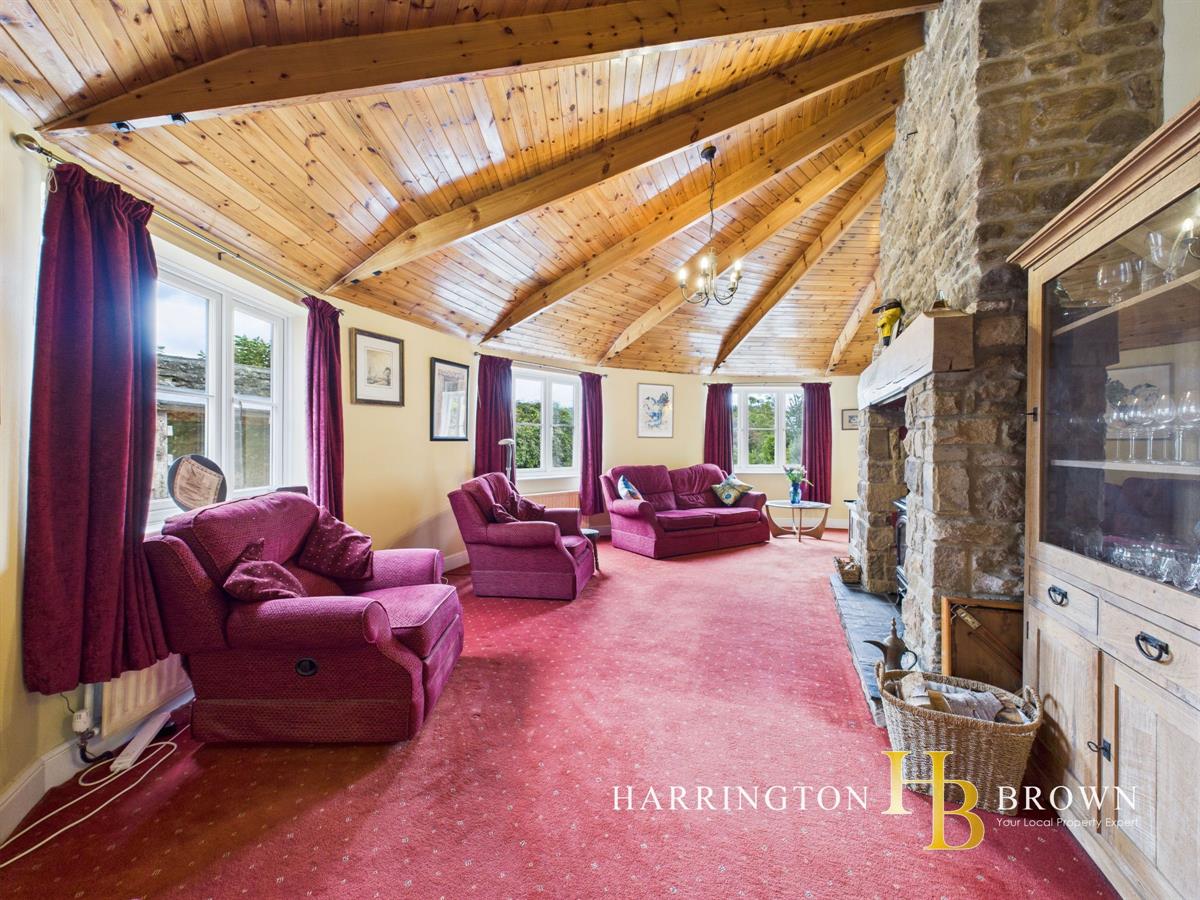 Living space is generous and full of character, with two reception rooms offering versatility for modern family life. The principal reception room, positioned at the southern end of the home, enjoys garden views and showcases a vaulted ceiling, exposed beams, and a striking stone fireplace with multi-fuel stove - a truly atmospheric space ideal for relaxing or entertaining. The second reception room is equally spacious and bright, with ceiling beams and twin windows that flood the space with natural light, making it ideal as a formal lounge, dining room or snug.