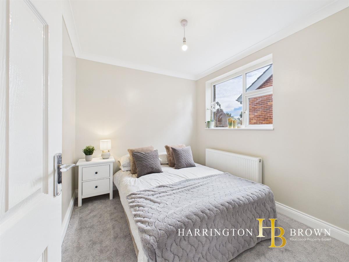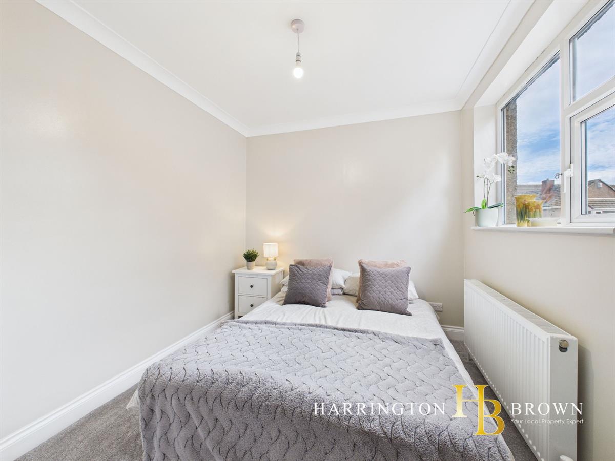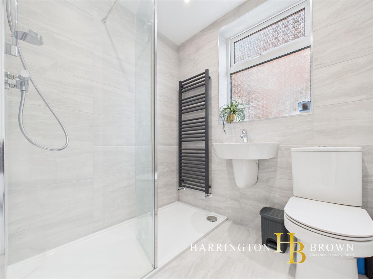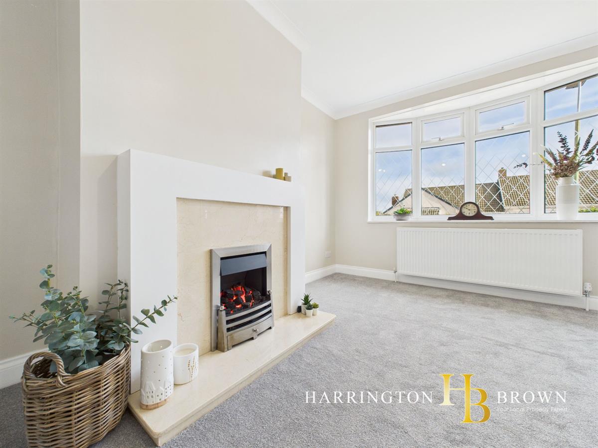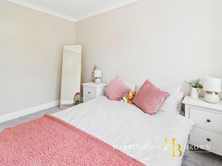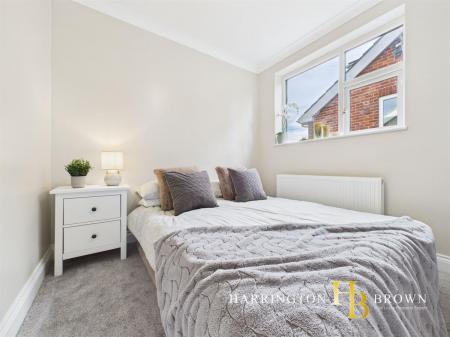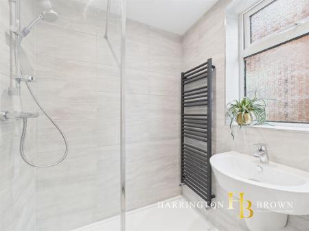 The entrance hall leads to a spacious lounge with gas fire and large window that floods the room with natural light. The hallway provides access to two double bedrooms, and the newly fitted shower room offers modern comfort with vanity unit and heated towel rail.