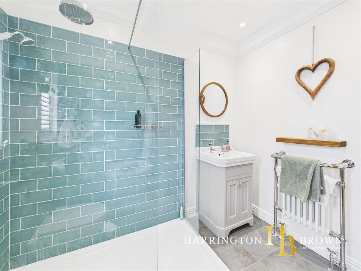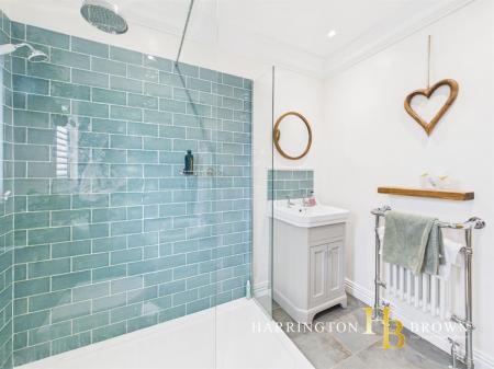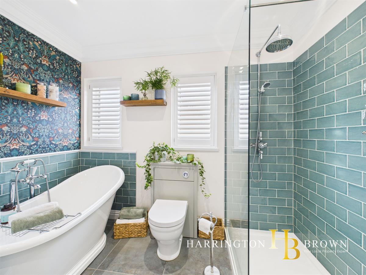 Completing the accommodation is a stunning showpiece bathroom designed for ultimate luxury. It boasts a freestanding bath, a walk-in shower, vanity unit with sink, heated towel rail, elegant metro tiles, and exquisite William Morris wallpaper, combining classic charm with modern sophistication.