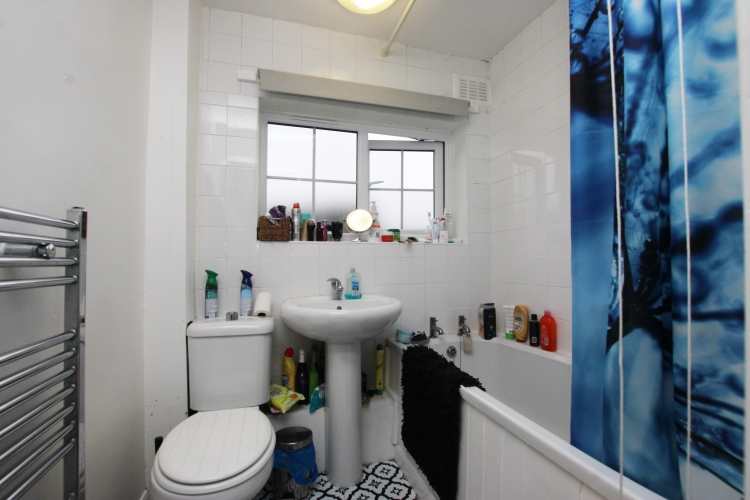 Obscure double-glazed window to rear aspect, full tiled surrounds, bath unit with shower over bath, vanity wash basin, low-level W/C, heated towel rail